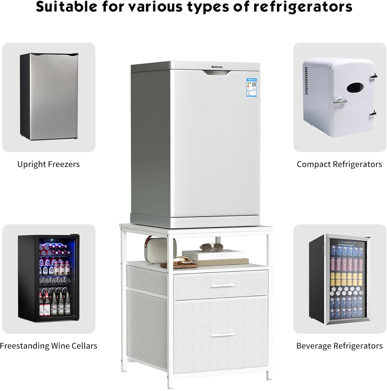 - Fits Various Mini Fridges - Our mini fridge cabinet is designed to fit most mini fridge models on the market, including standalone wine coolers, upright freezers, compact fridges, and beverage coolers, providing you with reliable support.