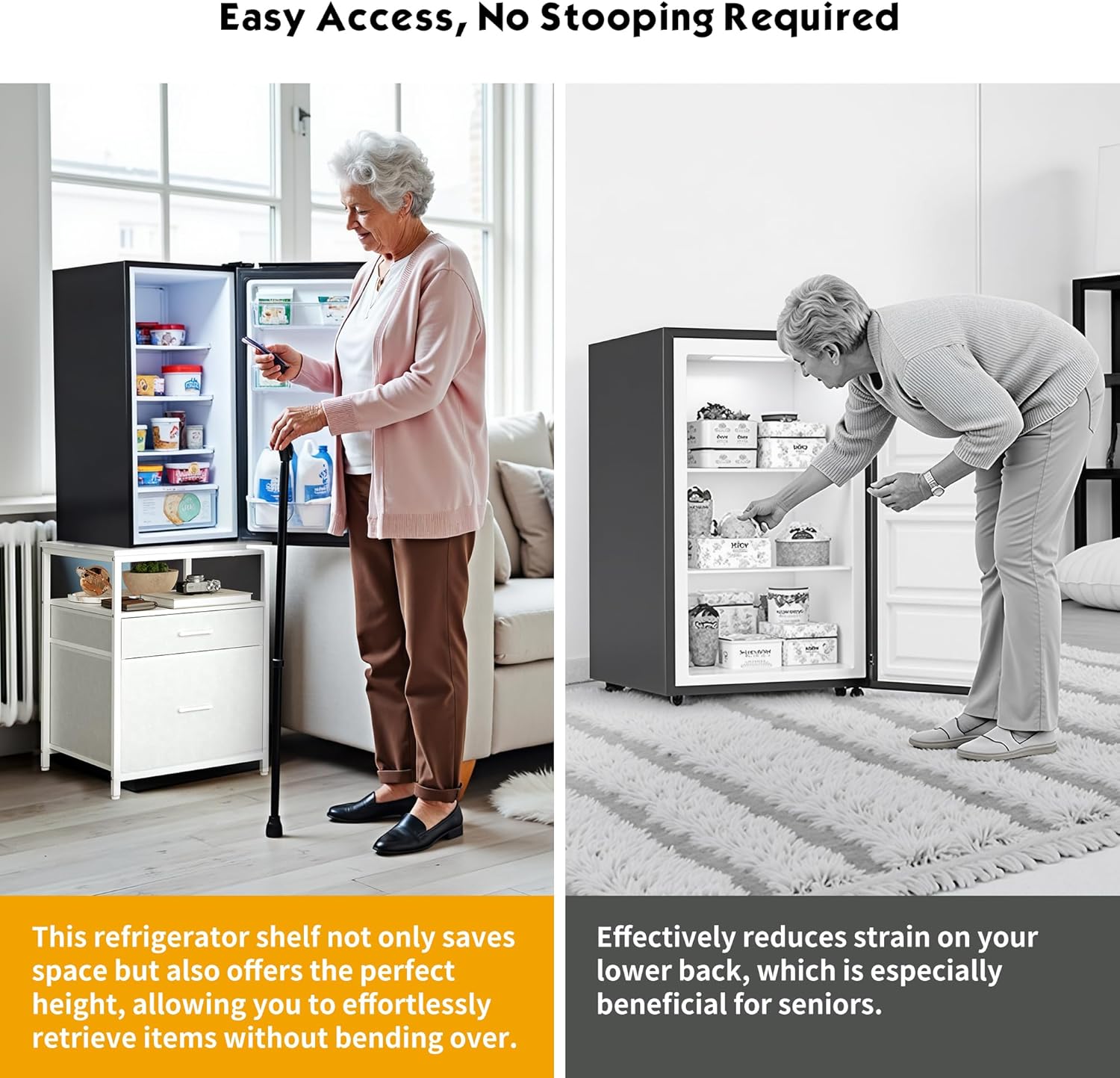- Grab Items with Ease - This mini fridge stand is designed to reduce strain on your back and lower back, making it especially suitable for seniors. By elevating your fridge, you'll no longer need to bend over frequently to access items, making everyday use more comfortable and convenient.