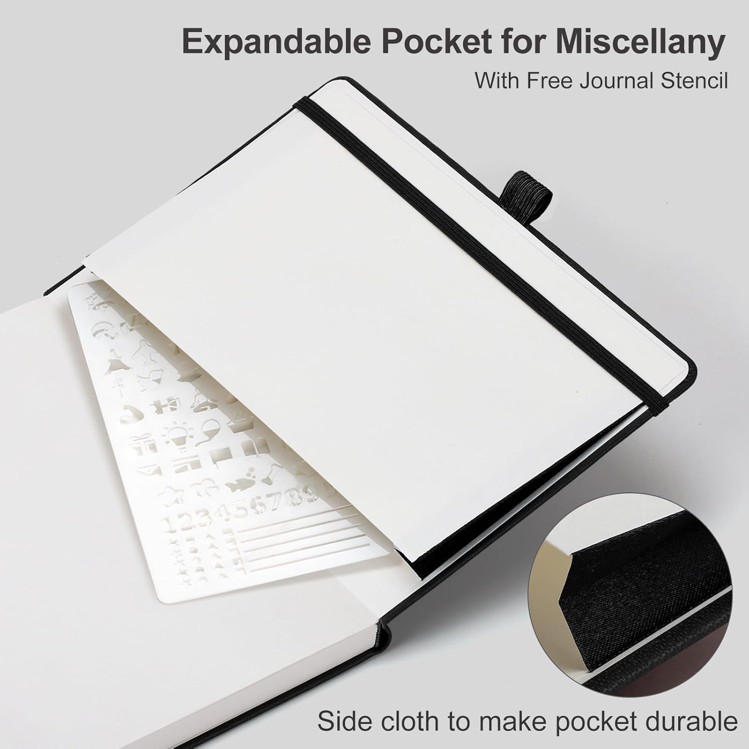 - CONVENIENT AND PRACTICAL LAYOUT: Features a pen holder for easy access to your pen, an elastic band to keep your notebook securely closed, 2 bookmarks for quick page referencing, an inner pocket for storing loose papers, and 2pcs journal stencils for additional creativity