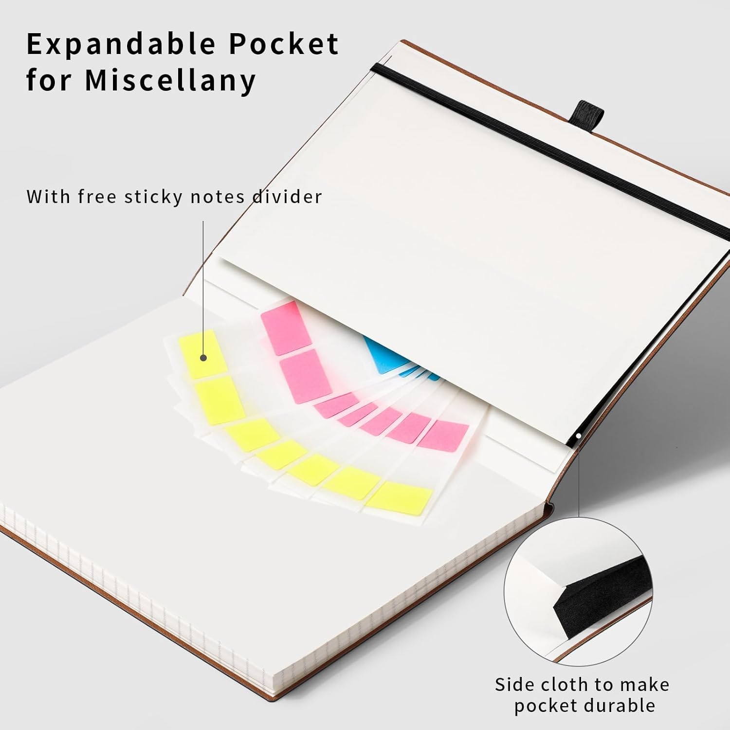 - CONVENIENT AND PRACTICAL LAYOUT: Features a pen holder for easy access to your pen, an elastic band to keep your notebook securely closed, 2 bookmarks for quick page referencing, an inner pocket for storing loose papers, and 18pcs sticky notes for additional organization and reminders
