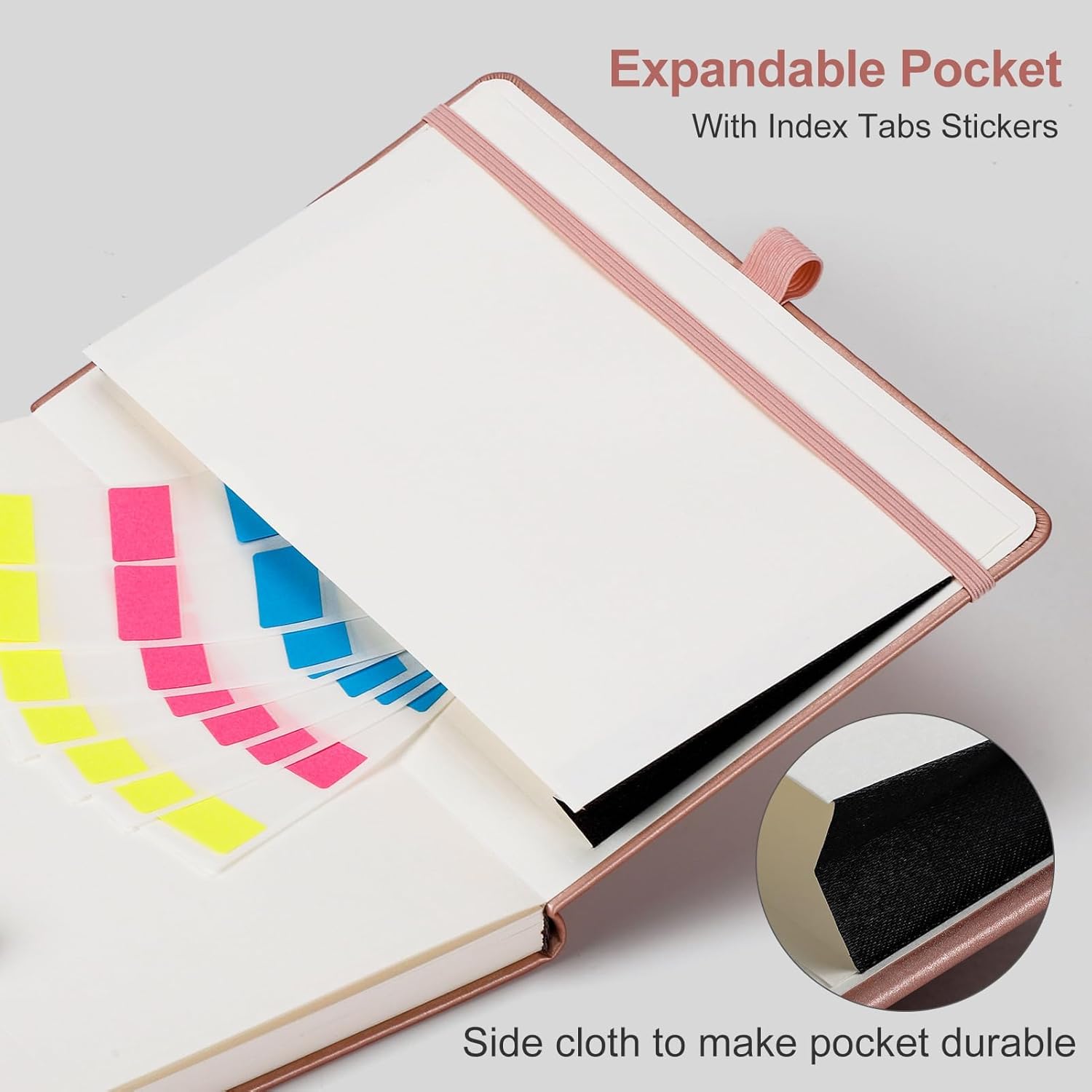 - CONVENIENT AND PRACTICAL LAYOUT: Features a pen holder for easy access to your pen, an elastic band to keep your notebook securely closed, 2 bookmarks for quick page referencing, an inner pocket for storing loose papers, and 18pcs sticky notes for additional organization and reminders