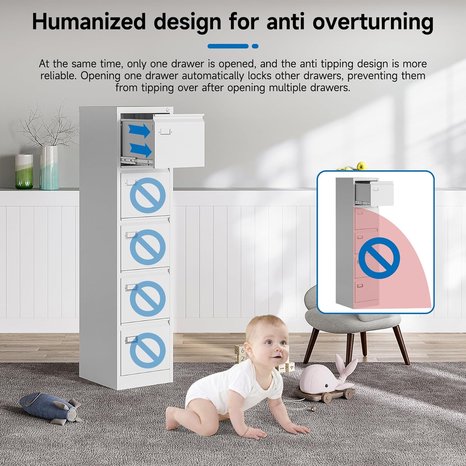 - 【HIGH SECURITY】This file cabinet can lock 5 drawers at the same time with one lock, and is equipped with 2 keys. With an anti-tilting mechanism, when 1drawer is opened, the interlocking system prevents the other drawer from opening, thereby preventing tipping and protecting your safety.