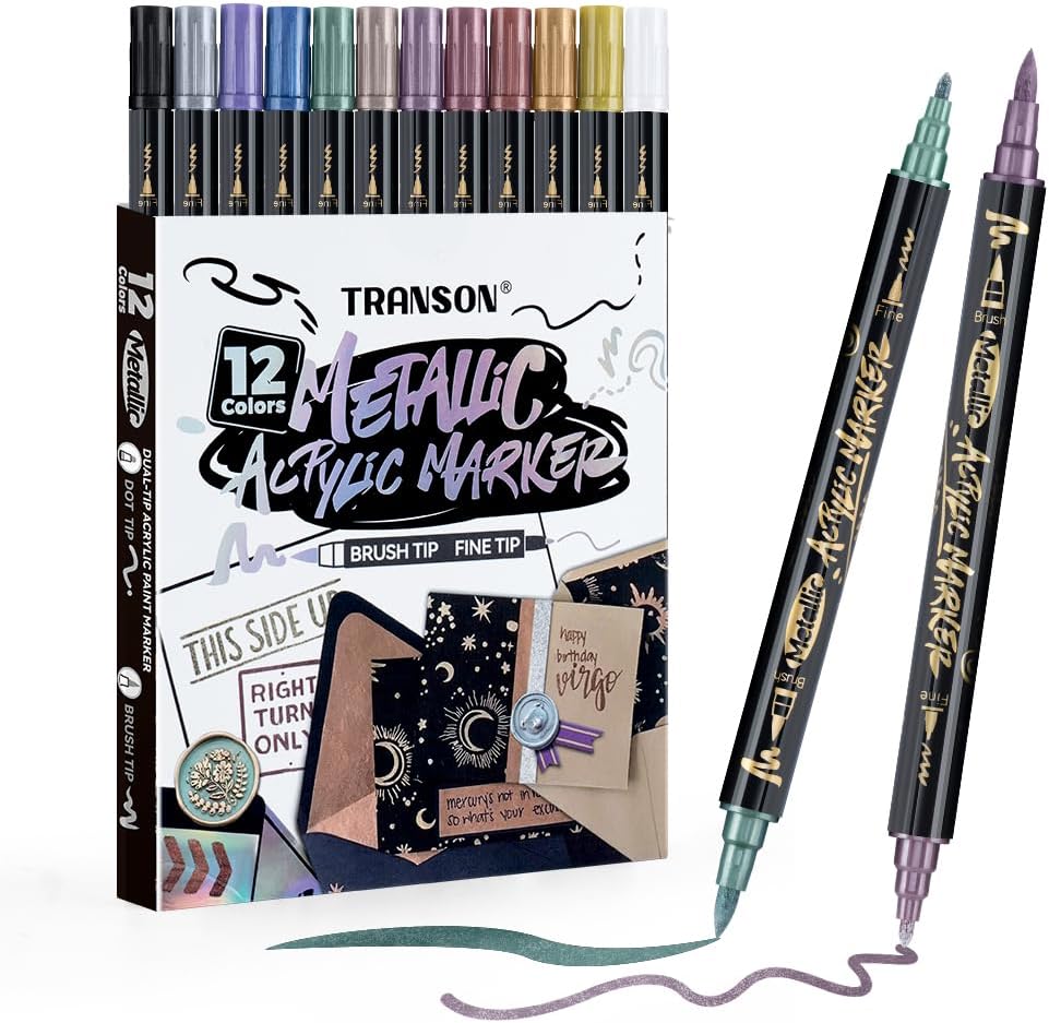 TRANSON 12Colors Metallic Paint Markers Brush and Fine Dual-tip for Rock Wood Ceramic Canvas DIY Painting Drawing