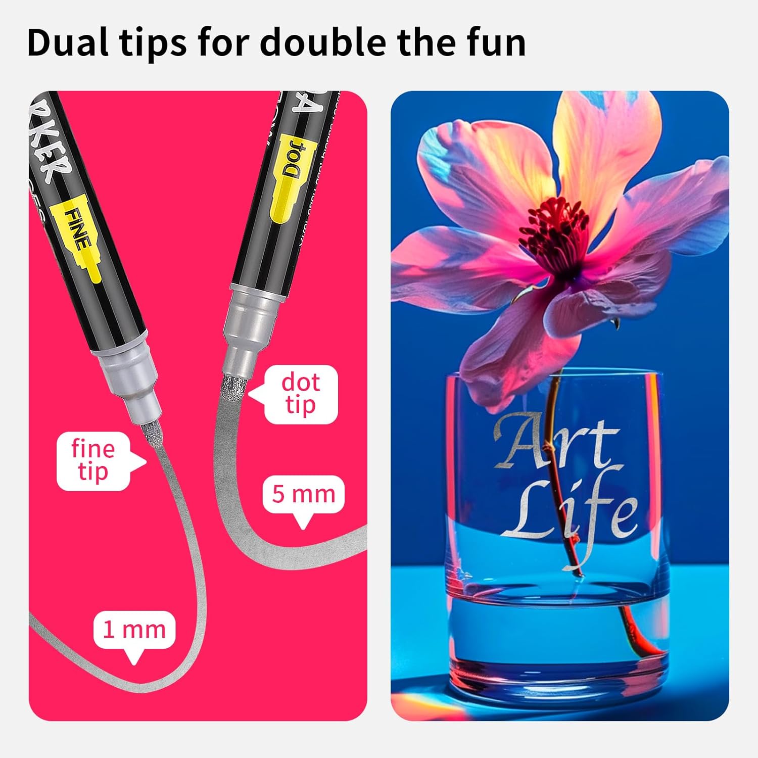- DUAL TIP: Our rock painting pens come with a 1-5 mm dot tip and a 1mm fine tip. Designed to give you the flexibility to switch effortlessly between fine lines and bold strokes, these paint pens acrylic markers expand your creative horizons and enhance the intricate details in your work.