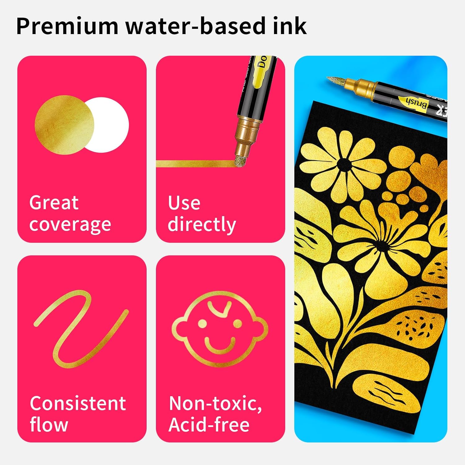 - SAFE & NON-TOXIC: The pigment ink is water-based which is odorless, and non-toxic. Each gold art pen conforms to ASTM D-4236 standards. Kids and adults can enjoy drawing with this gold art pen. These gold magic markers are ready for any project, no matter the event! Create art for Christmas, a birthday, or wedding decorations.