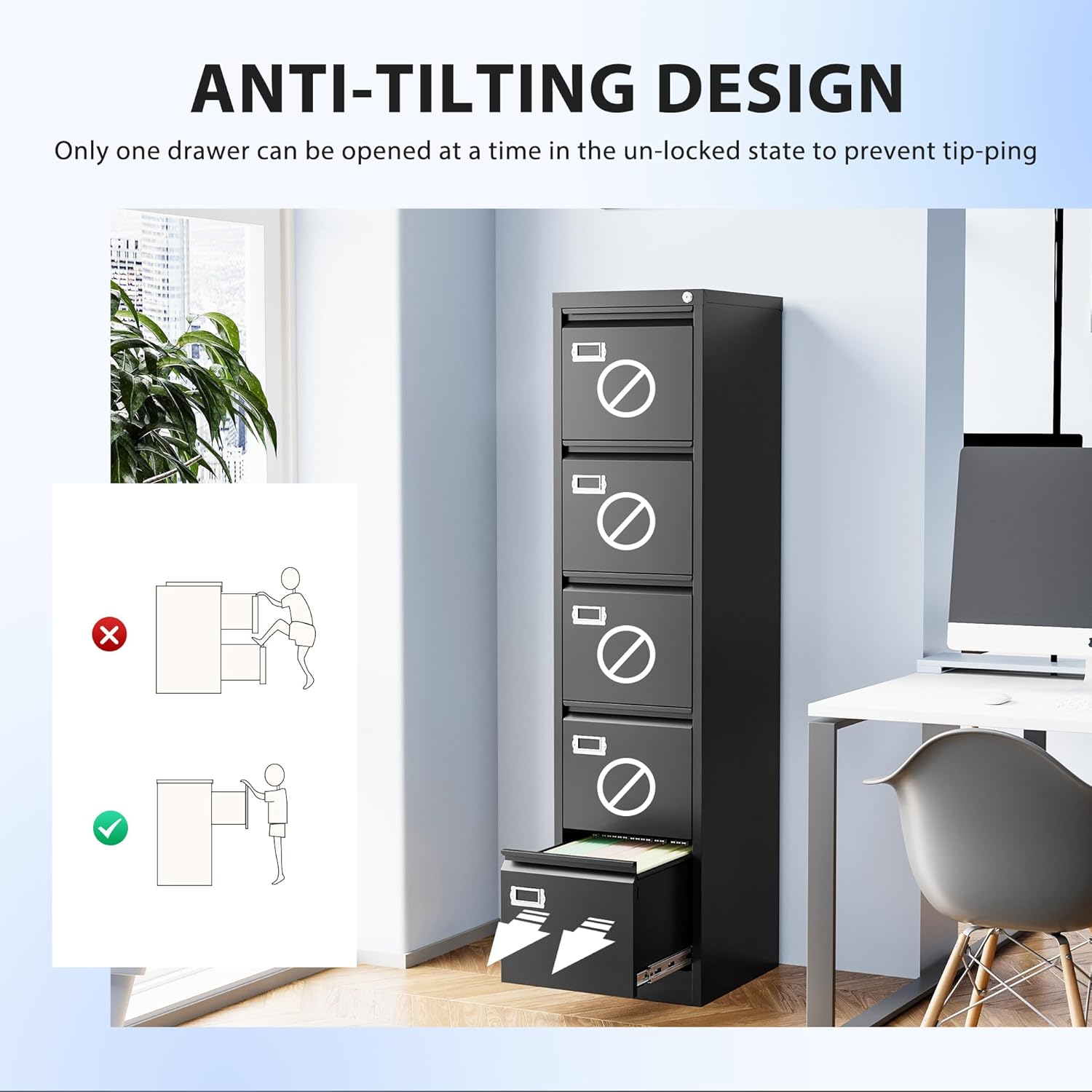 - 【Anti-Tilt Design】This office file cabinets has a lock that can lock all five drawers and comes with two keys. It helps you keep your valuables and documents safe. In the unlocked state, only one drawer can be pulled out at a time, preventing the movement of multiple drawers causing the overall center to shift and the box to fall.