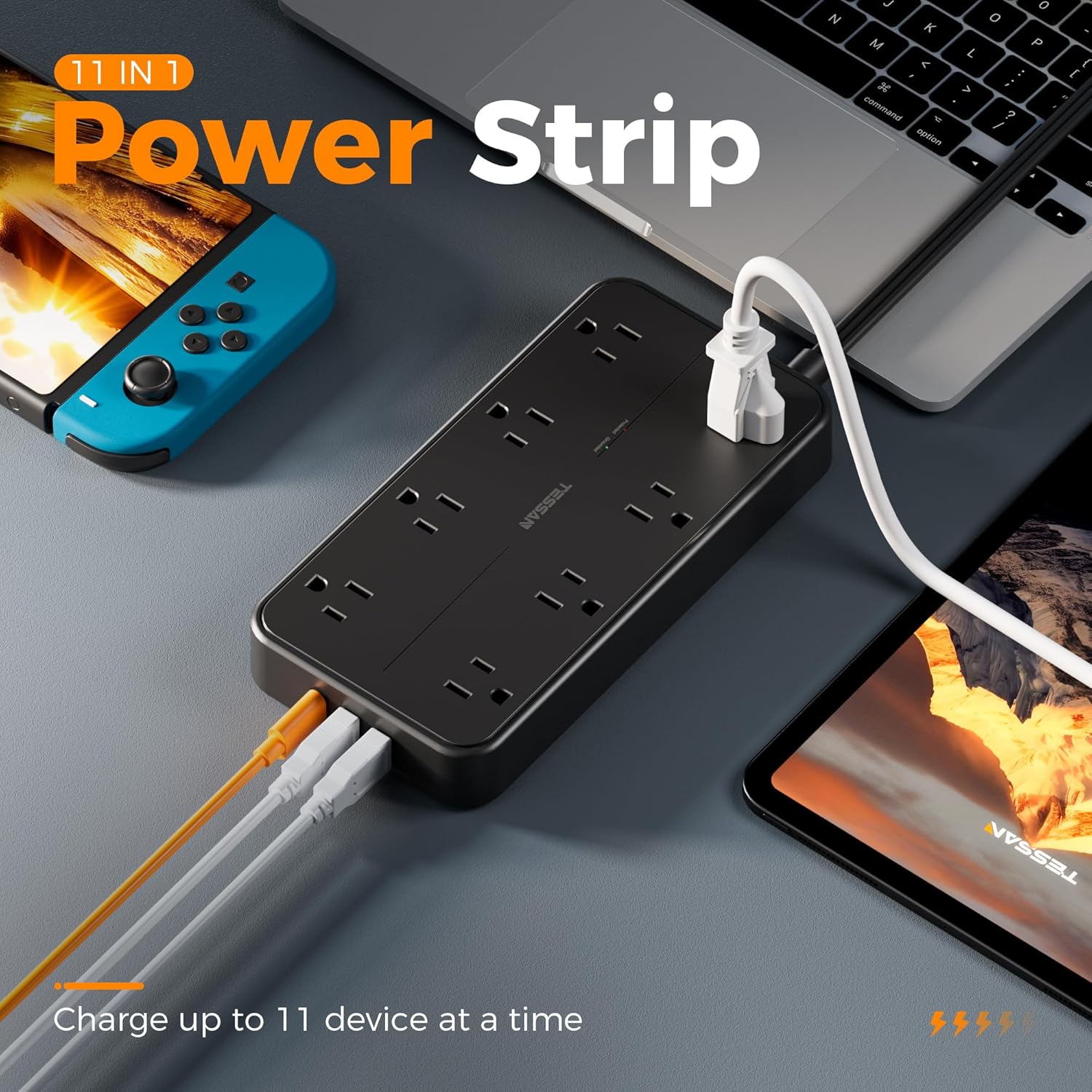 Surge Protector Power Strip, TESSAN Flat Plug Extension Cord with 8 Outlets 3 USB Ports(1 USB C), 1080 Joules Protection, 6 Ft, Wall Mountable Charging Station for Home Office Dorm Room Essentials