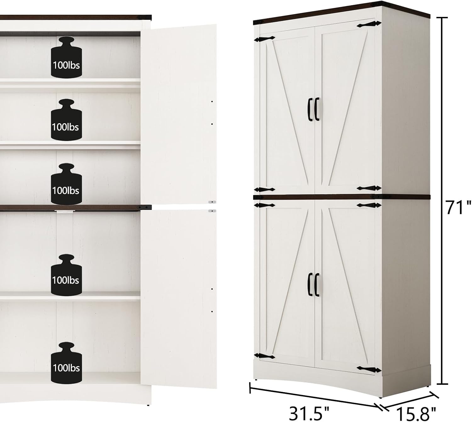 - Large Kitchen Pantry Cabinet:This kitchen pantry cabinet measures:15.7in D,31.5in W,71in H.There are 5 storage spaces in the storage cabinet.The three middle shelves within the cabinet are both adjustable and removable, featuring three height options that cater to your different storage preferences.