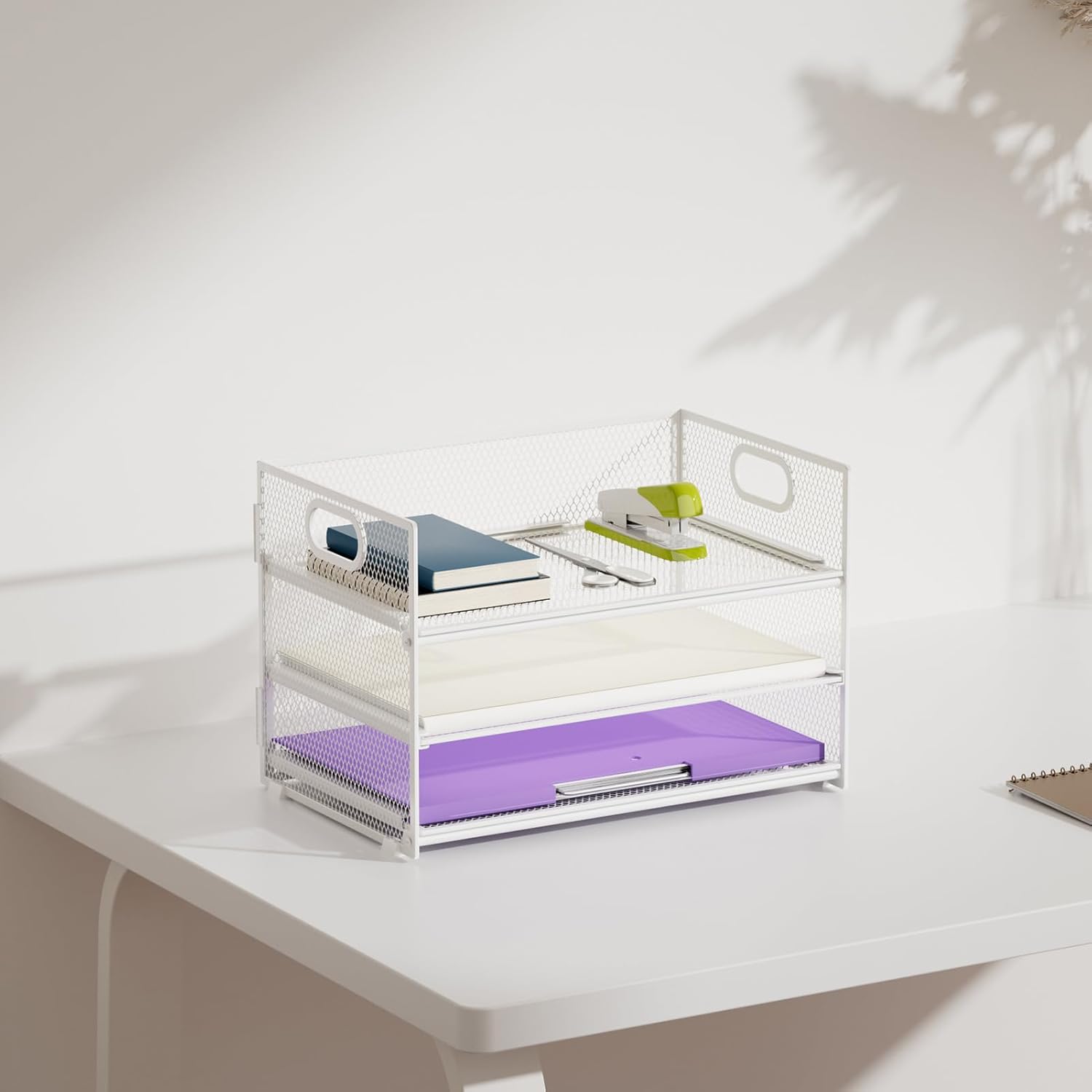 Marbrasse 3 Tier Paper Organizer Letter Tray, Mesh File Organizer with Handle, Paper Sorter Desk Organizer for Home Office Supplies(White)