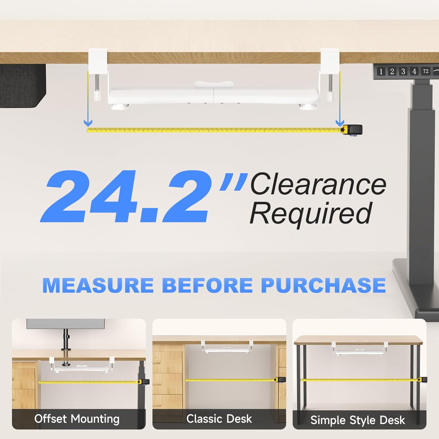 - Universal - This 20" (24.2" including clamps) x 11.8" under-desk keyboard tray holds your small keyboard, mouse, and other small accessories below the desktop to add work space. Please not it does NOT fit if your desk thickness is over 1.57”.