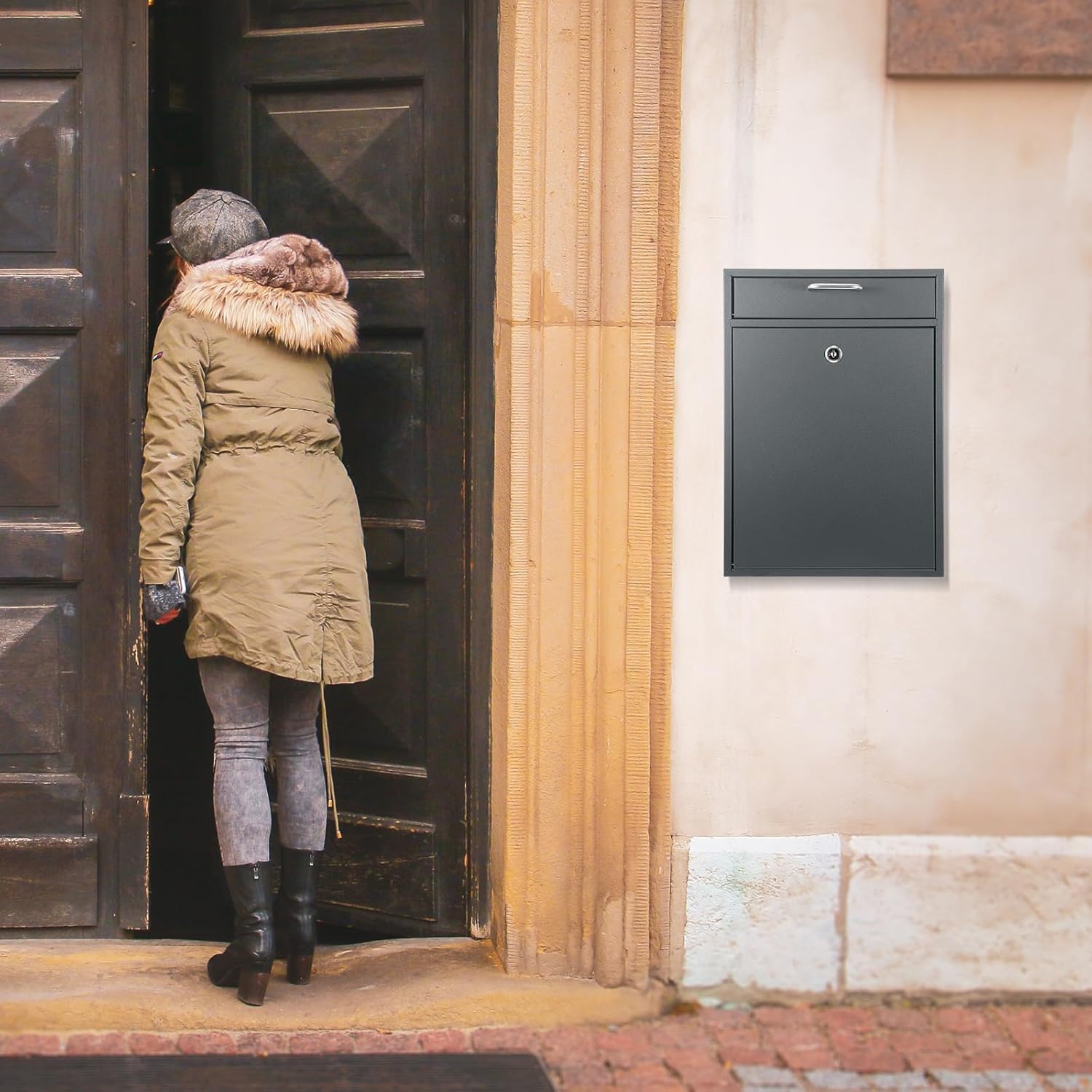Locking Mailbox with Key for Outdoor 16.2 x 11.2 x 4.7 Inches Large Wall Mount Mail Box with Lock Security Mail Drop Metal Collection Boxes Hanging Secure Postbox(Dark Gray)
