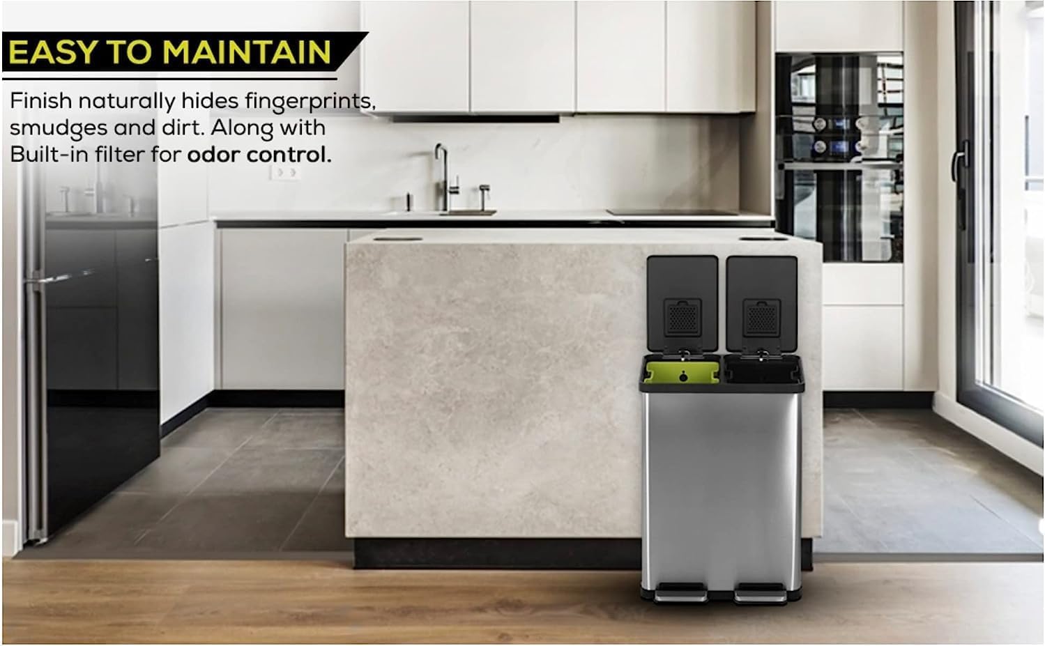SIMPLI-MAGIC 16 Gallon (38L x 22L) Dual Compartment Step Trash Can – Kitchen Garbage Can with Waste & Recycling Bins – Slow-Close Lid, Odor Control, Hands-Free, Inner Bases, Brushed Stainless Steel
