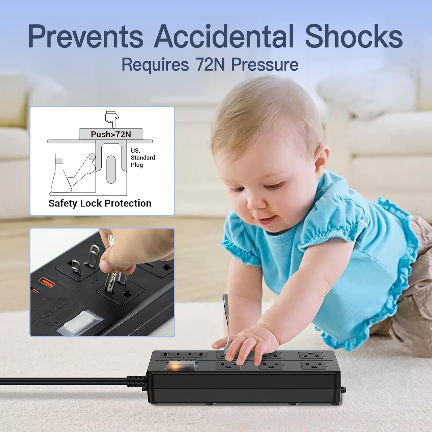 - Electric Shockproof Outlet Strip: Designed for outdoor use,this shockproof strip enhances safety by preventing objects from reaching the inner circuit;Tailored for US plugs;Note: Plug insertion may require extra force due to the protective design.