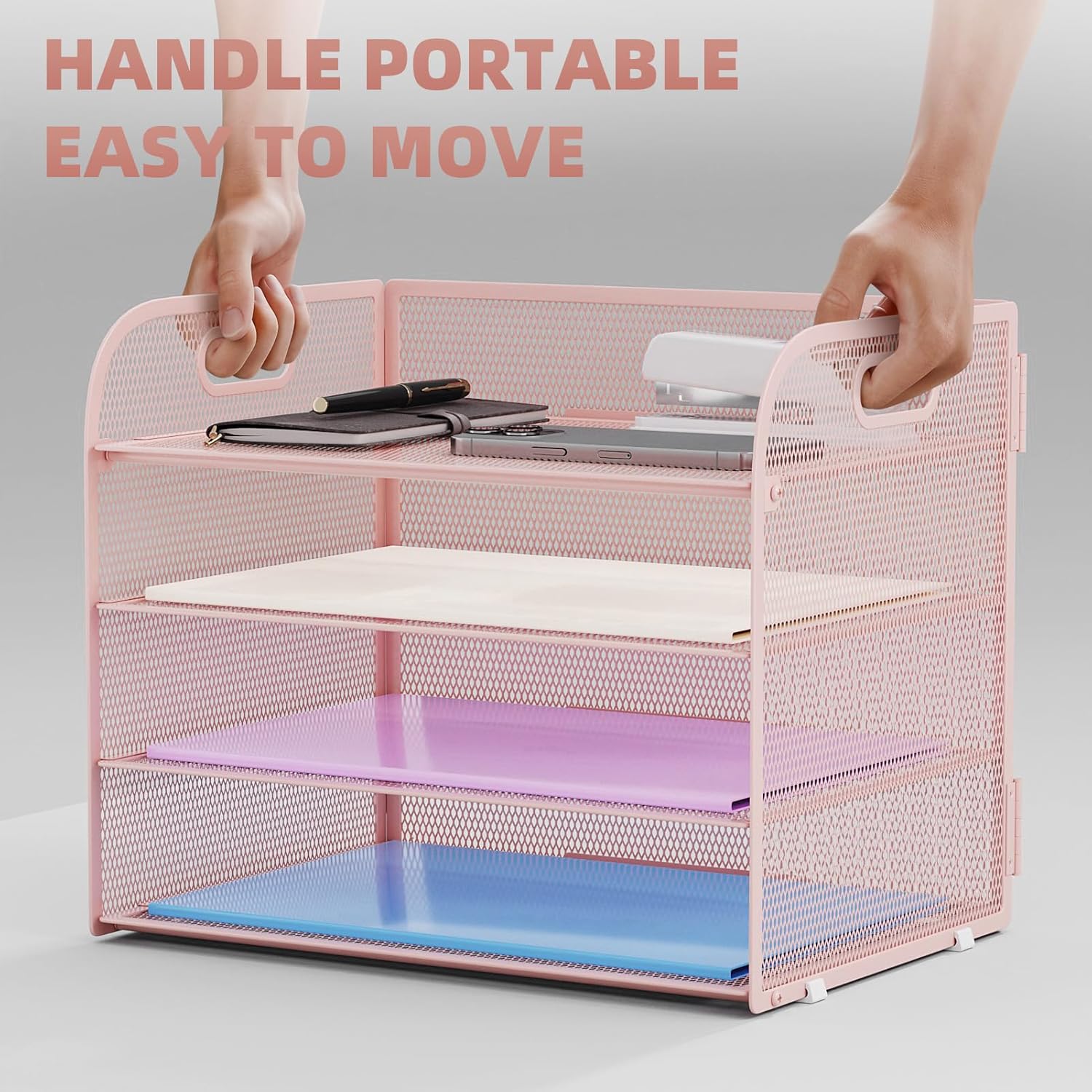 Marbrasse 4 Tier Paper Organizer Letter Tray - Mesh Desk File Organizer with Handle, Paper Sorter Organizer for Letter/A4 Office File Folder Holder (Pink, 12.6" x 9.1" x 10.7")