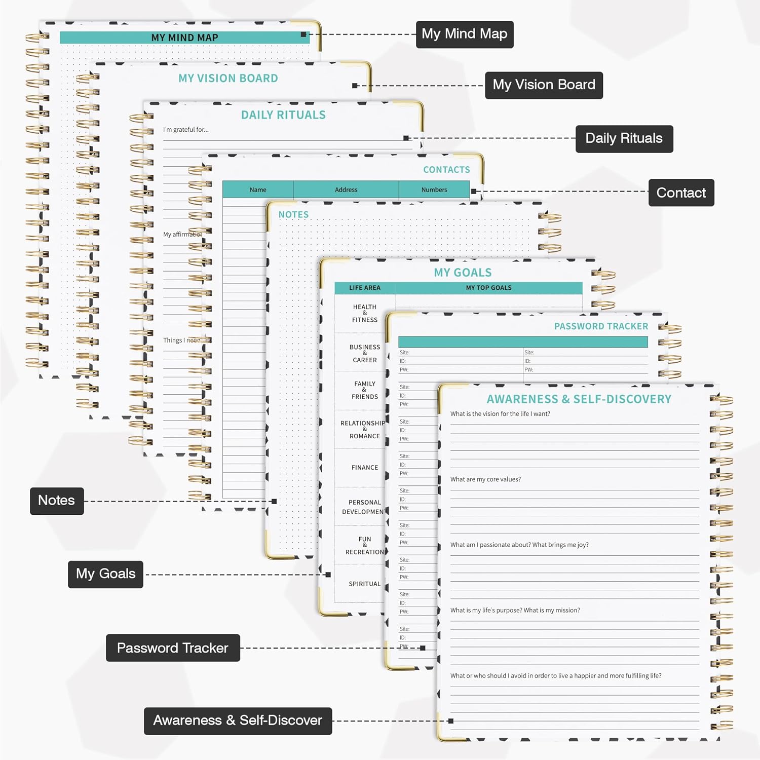 - Undated Clear Layout: With 12 blank months and 53 weeks, a 7 AM to 8 PM daily schedule section, and additional sections for contacts, passwords, awareness and self-discovery, daily rituals, goals, and notes, this life planner offers the freedom to plan your schedules at any time.