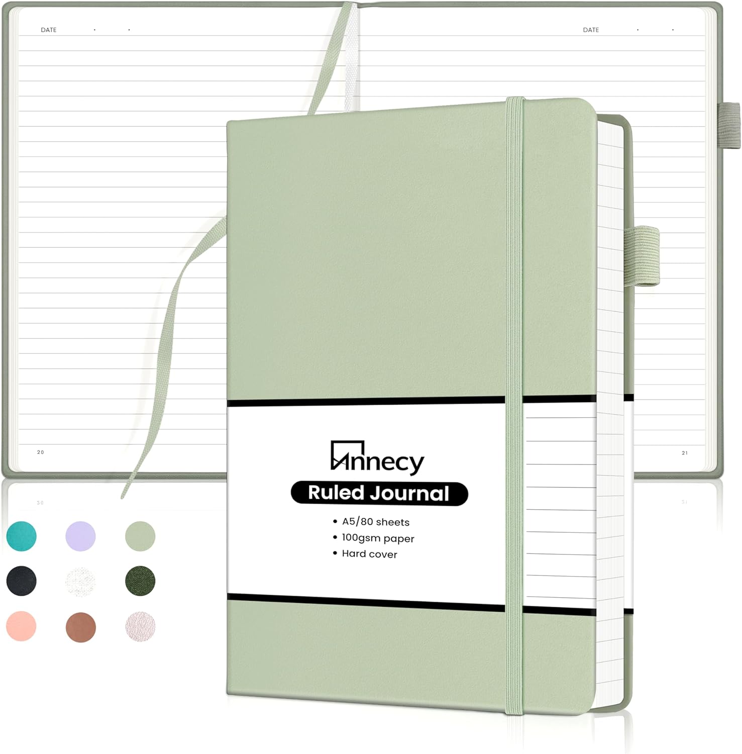 Annecy Lined Journal Notebook, Hardcover Numbered College Ruled Journal, Medium 5.5x 8.25, 160 Pages 100GSM Writing Paper, Grey Green