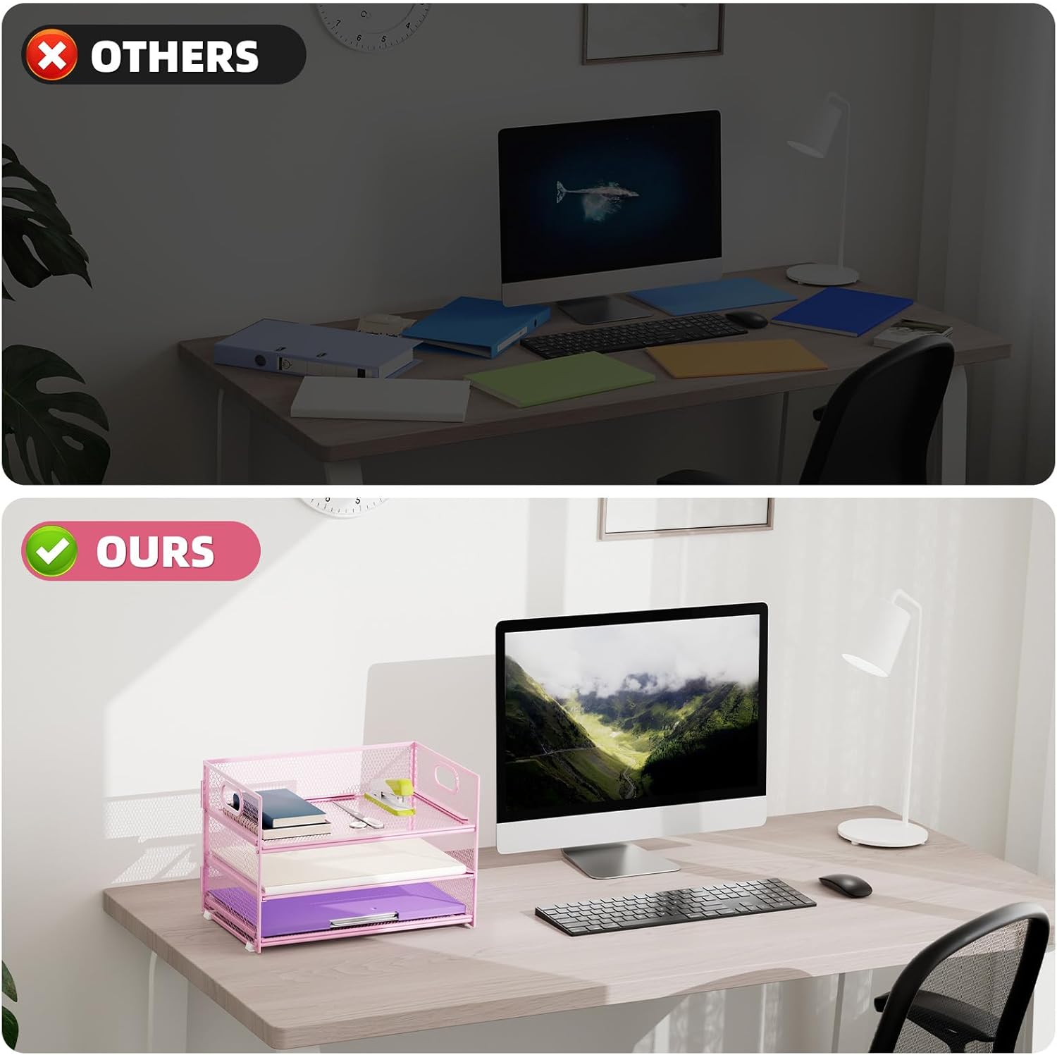 Marbrasse 3 Tier Paper Organizer Letter Tray, Mesh File Organizer with Handle, Paper Sorter Desk Organizer for Home Office Supplies(Pink)