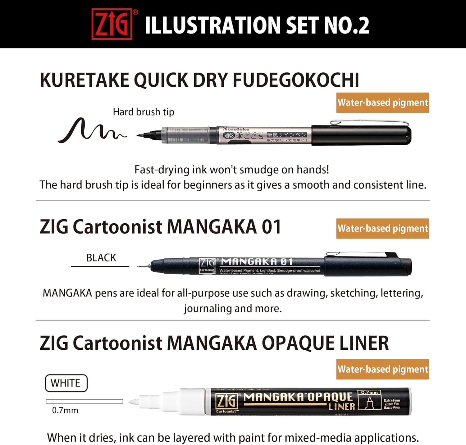 - [ZIG Cartoonist MANGAKA OPAQUE LINER] This lightfastness and opaque water-based pigment ink offers high coverage, allowing you to enjoy vivid colors stading out on dark papers. Once the ink dries, it wonβt wash away with water and good for layering.