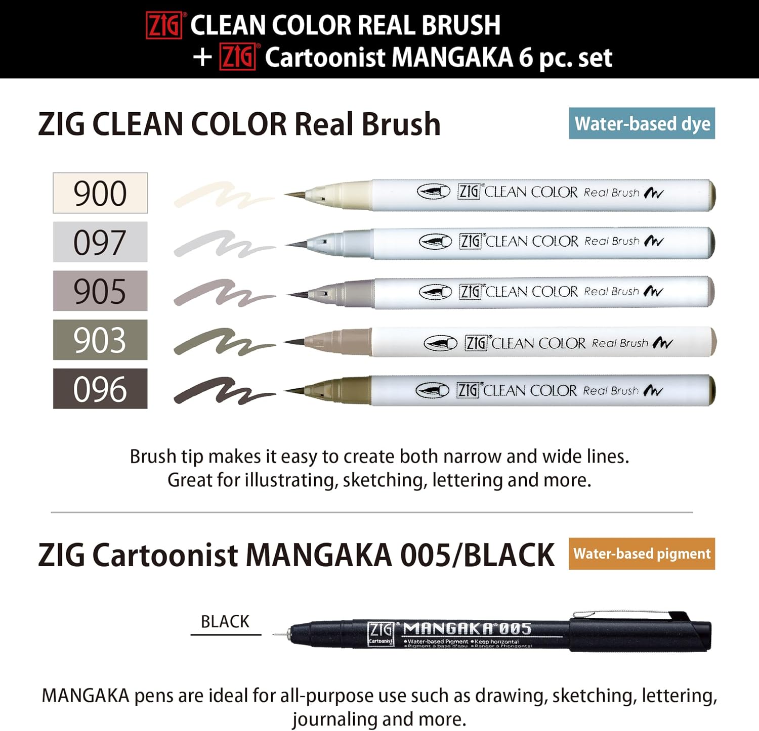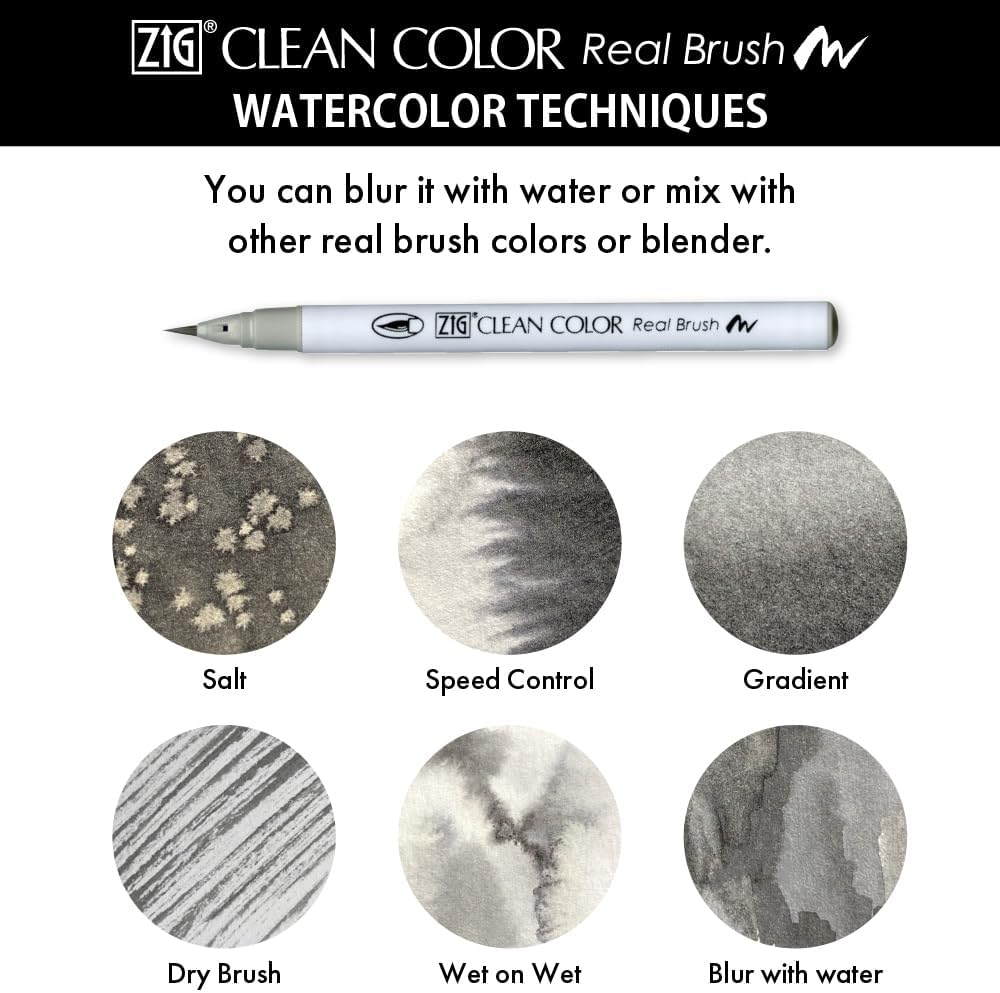 - [ZIG CLEAN COLOR Real Brush] It is a brush-type watercolor pen, so it can be used in a wide range of applications such as illustration, design, lettering, and Manga. Because it is a water-based dye ink, you can blur it with water or mix it with other real brush colors or a blender. Water-based dye ink.