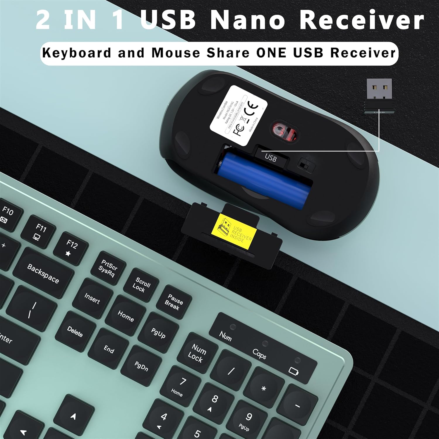 - PLUG AND PLAY: Wireless keyboard and mouse share one USB receiver (under the mouse cover), plug the USB receiver into the computer USB port and it will work. 2.4GHz wireless technology provides a reliable connection range of up to 33ft (10 meters) without any driver