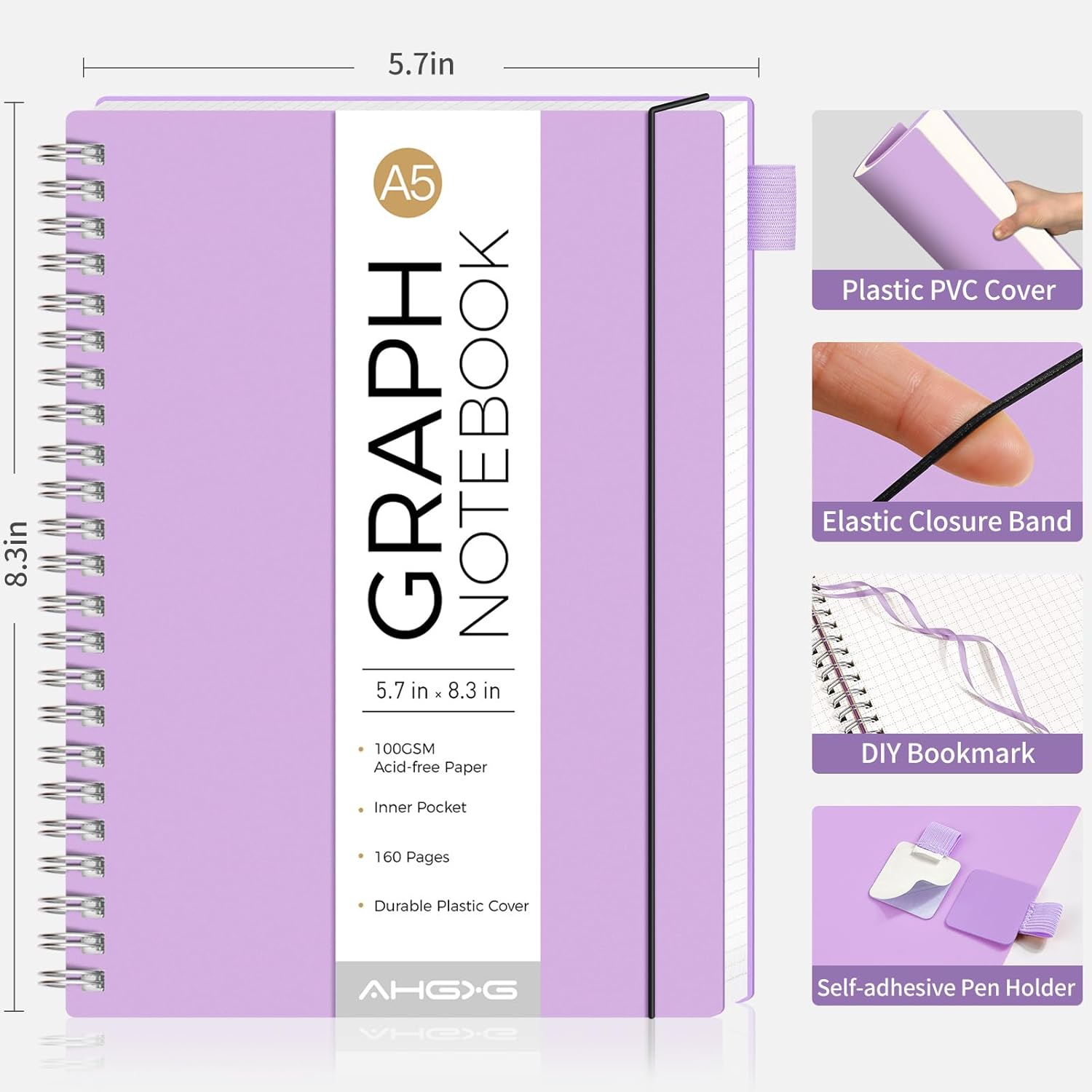 AHGXG Graph Paper Notebook - Spiral Notebook Journal 160 Pages, A5 Graph Notebook 5.7" x 8.3", 100 gsm Thick Grid Paper, Waterproof Plastic Cover, for School Writing Engineering Math, Purple