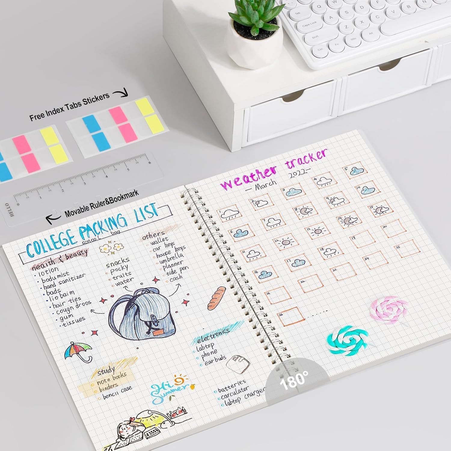 - PRACTICAL LAYOUT: Equipped an elastic band, a self-adhesive pen holder and removable bookmark ruler to keep your notebook organized. Comes with a DIY bookmark with a ribbon for self-attachment to the spiral, serving as a bookmark. Features a double-sided pocket for storing miscellany and 18pcs sticky notes for additional organization and reminders