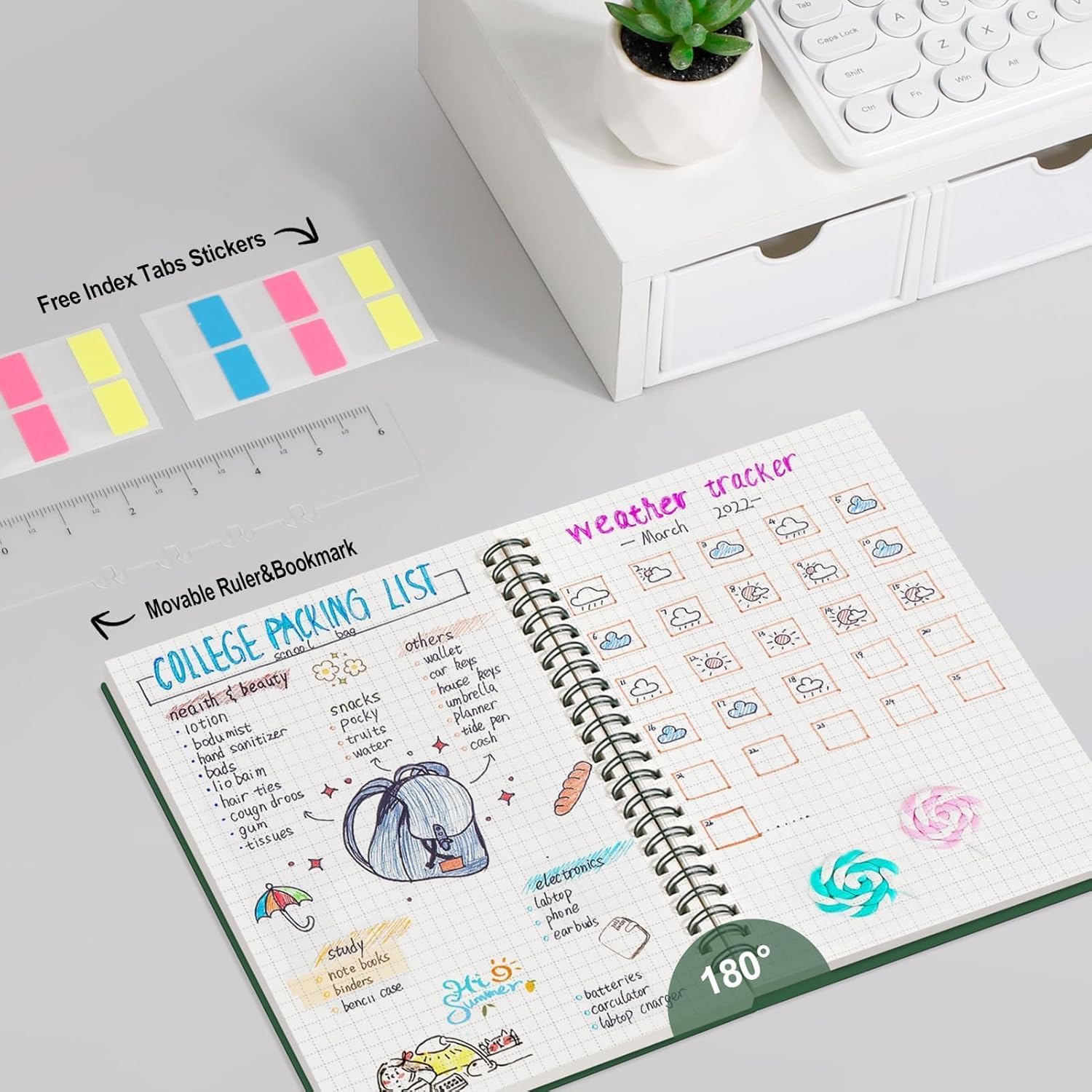 - PRACTICAL LAYOUT: Equipped an elastic band, a self-adhesive pen holder and removable bookmark ruler to keep your notebook organized. Comes with a DIY bookmark with a ribbon for self-attachment to the spiral, serving as a bookmark. Features a double-sided pocket for storing miscellany and 18pcs sticky notes for additional organization and reminders