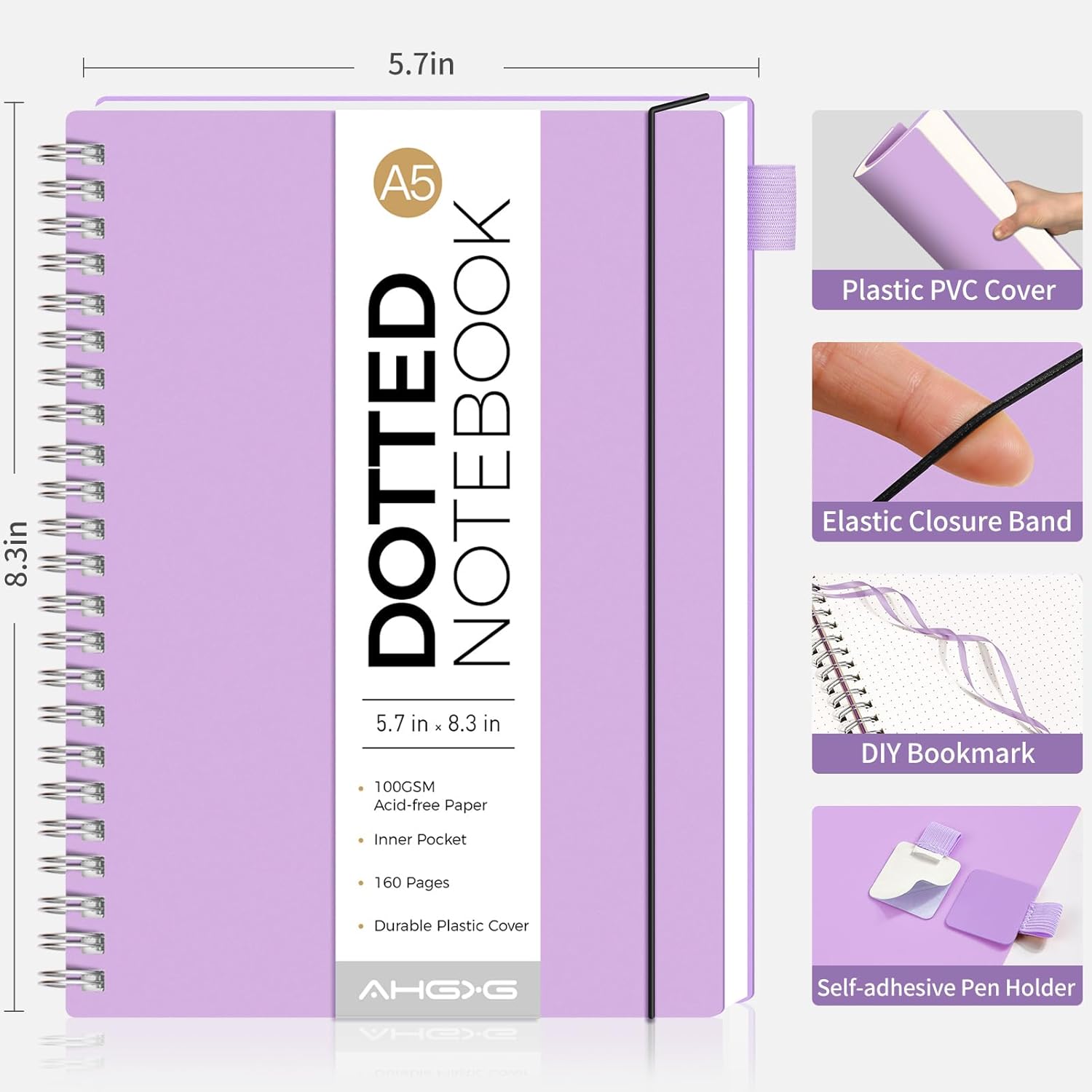AHGXG Bullet Dotted Journal - Dot Grid Spiral Notebook A5, 160 Pages, 100 GSM Thick Paper, Waterproof Plastic Cover Journals for Bullet Journaling, Sketching, 5.7" x 8.3", Purple