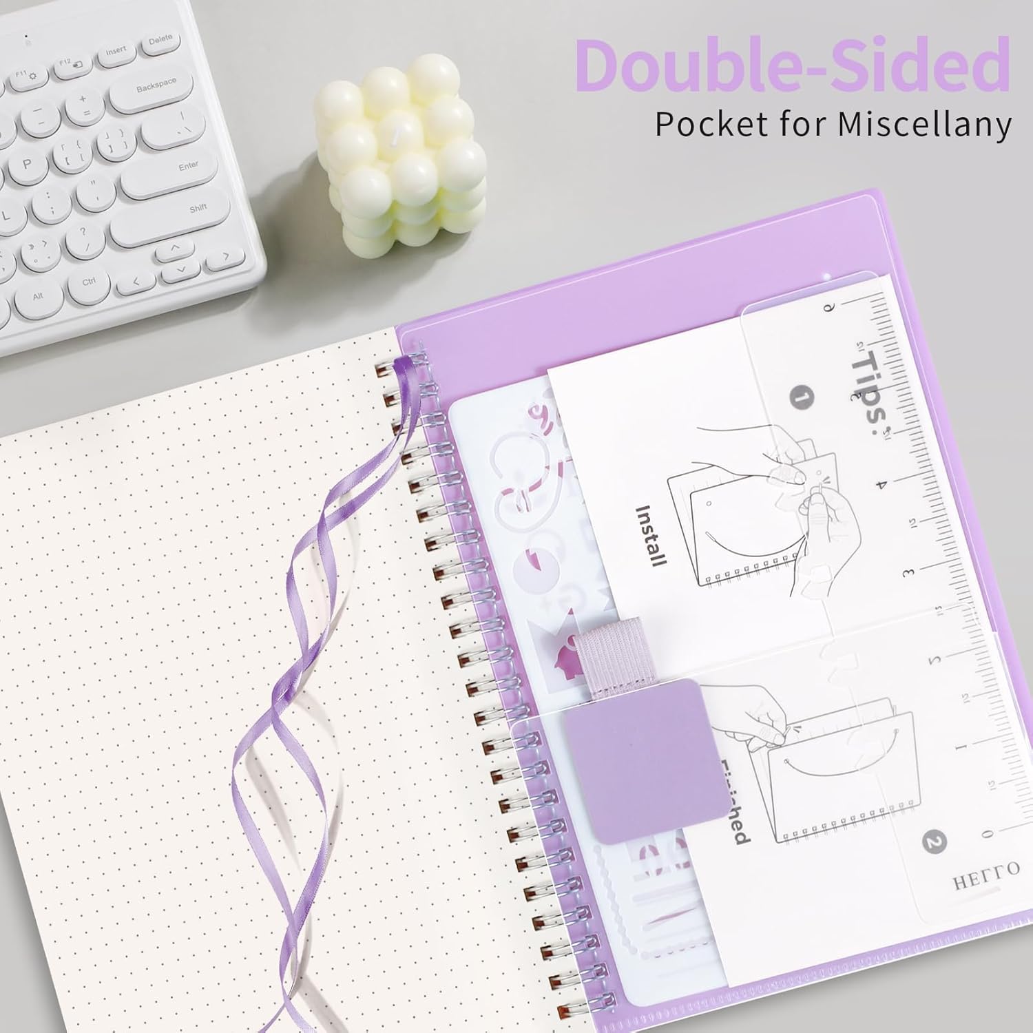 - PRACTICAL LAYOUT: Equipped an elastic band, a self-adhesive pen holder and removable bookmark ruler to keep your notebook organized. Comes with a DIY bookmark with a ribbon for self-attachment to the spiral, serving as a bookmark. Features a double-sided pocket for storing miscellany and 18pcs sticky notes for additional organization and reminders