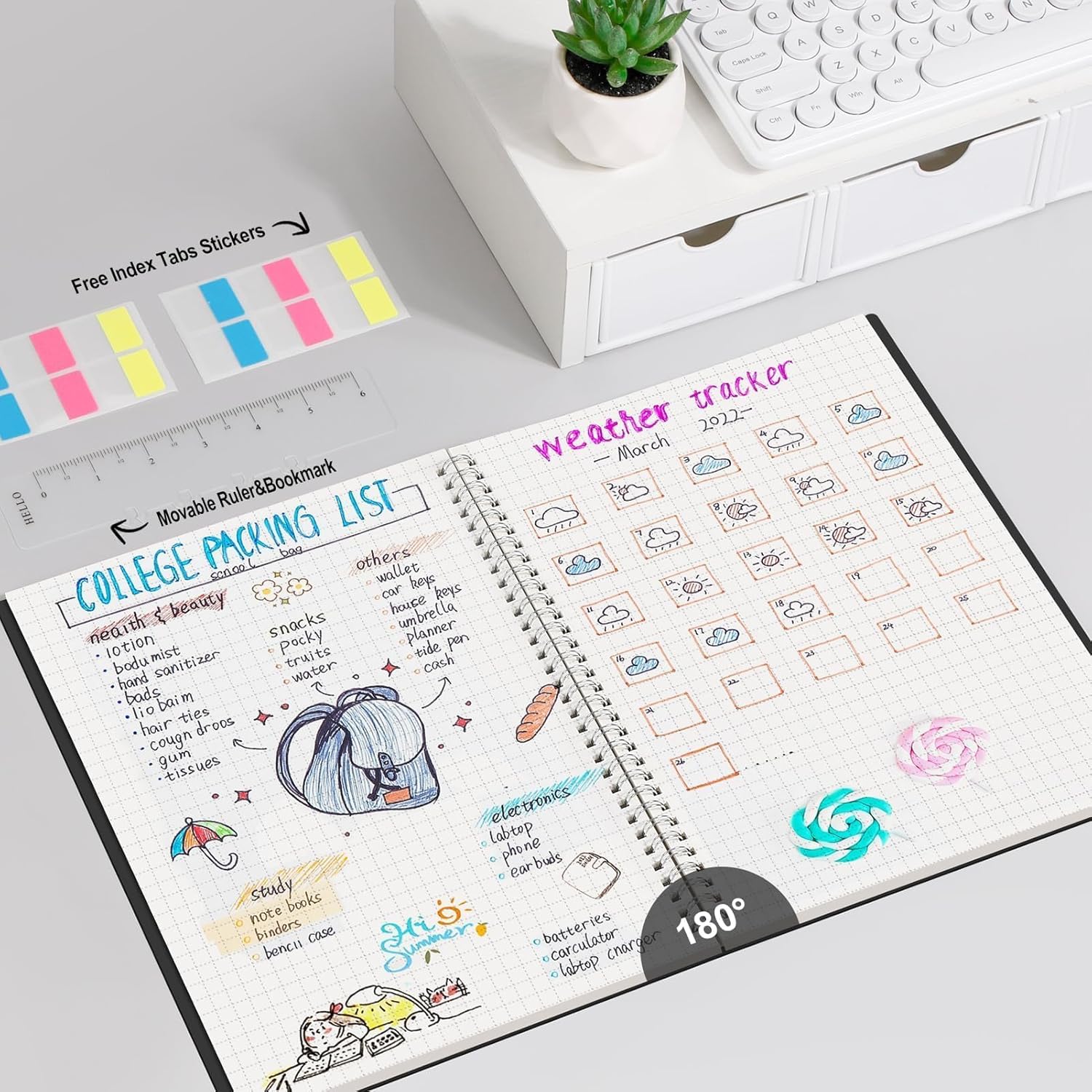 - PRACTICAL LAYOUT: Equipped an elastic band, a self-adhesive pen holder and removable bookmark ruler to keep your notebook organized. Comes with a DIY bookmark with a ribbon for self-attachment to the spiral, serving as a bookmark. Features a double-sided pocket for storing miscellany and 18pcs sticky notes for additional organization and reminders