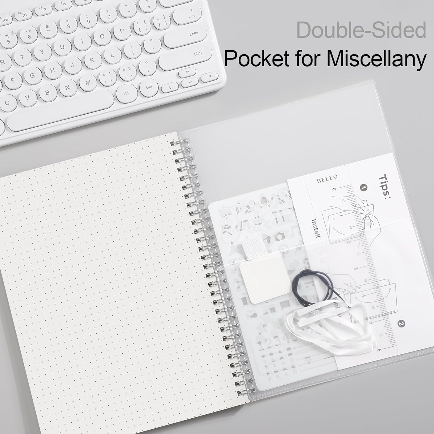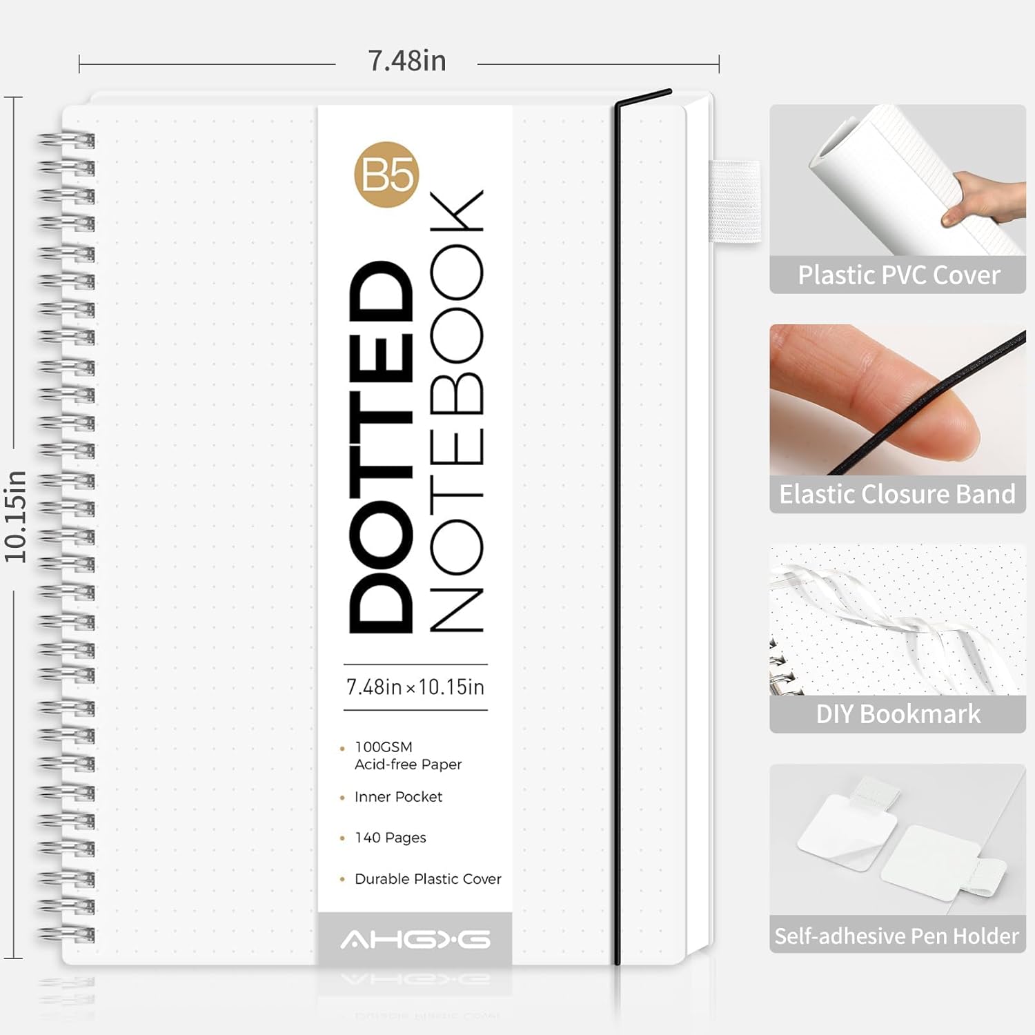 AHGXG Bullet Dotted Journal - Dot Grid Spiral Notebook B5, 140 Pages, 100 GSM Thick Paper, Waterproof Plastic Cover Journals for Bullet Journaling, Sketching, 7.6" x 10", Transparent