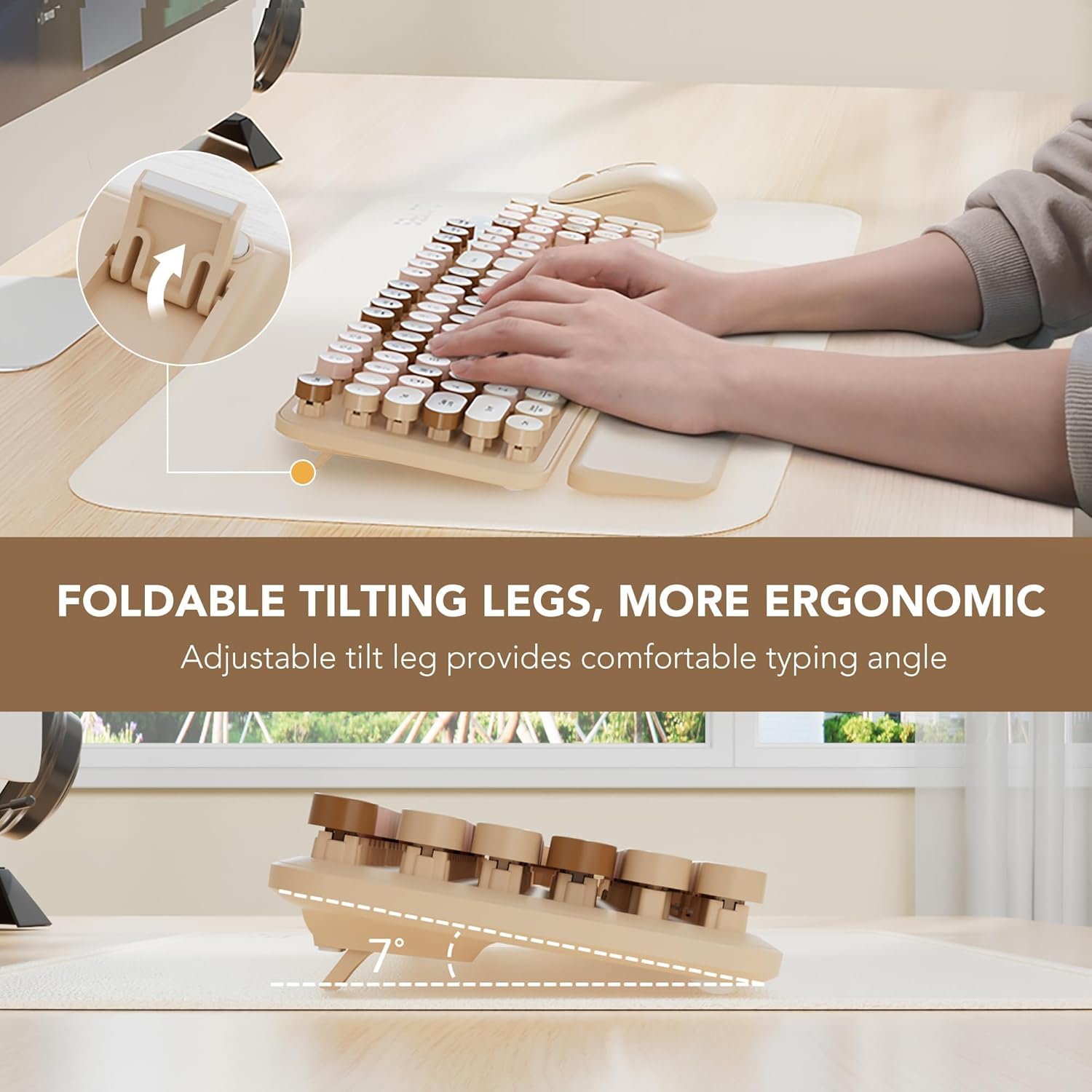 Wireless Keyboard and Mouse Combo, Round Keycaps, Full-Size Retro Typewriter Keyboard with Detachable Wrist Rest, Sleep Mode & Tilt Legs, 2.4GHz Cordless Connection for Mac/Windows/PC (Latte)