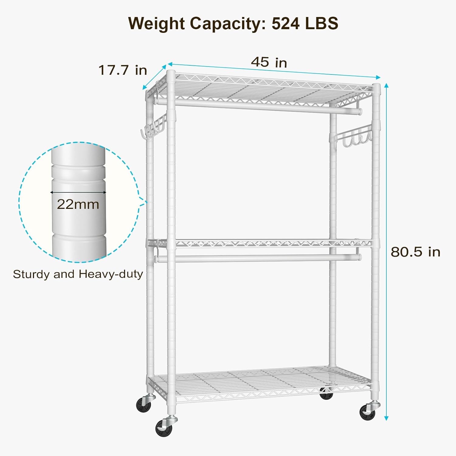 - [Multifunctional Space Saver]: The portable clothes rack with 3 wire shelves, 2 metal hanger rods, and 1 pair of side hooks offers a 524-pound storage capacity. Itβs suitable to place in the bedroom, laundry room, cloakroom, garage, living room, and other places you want
