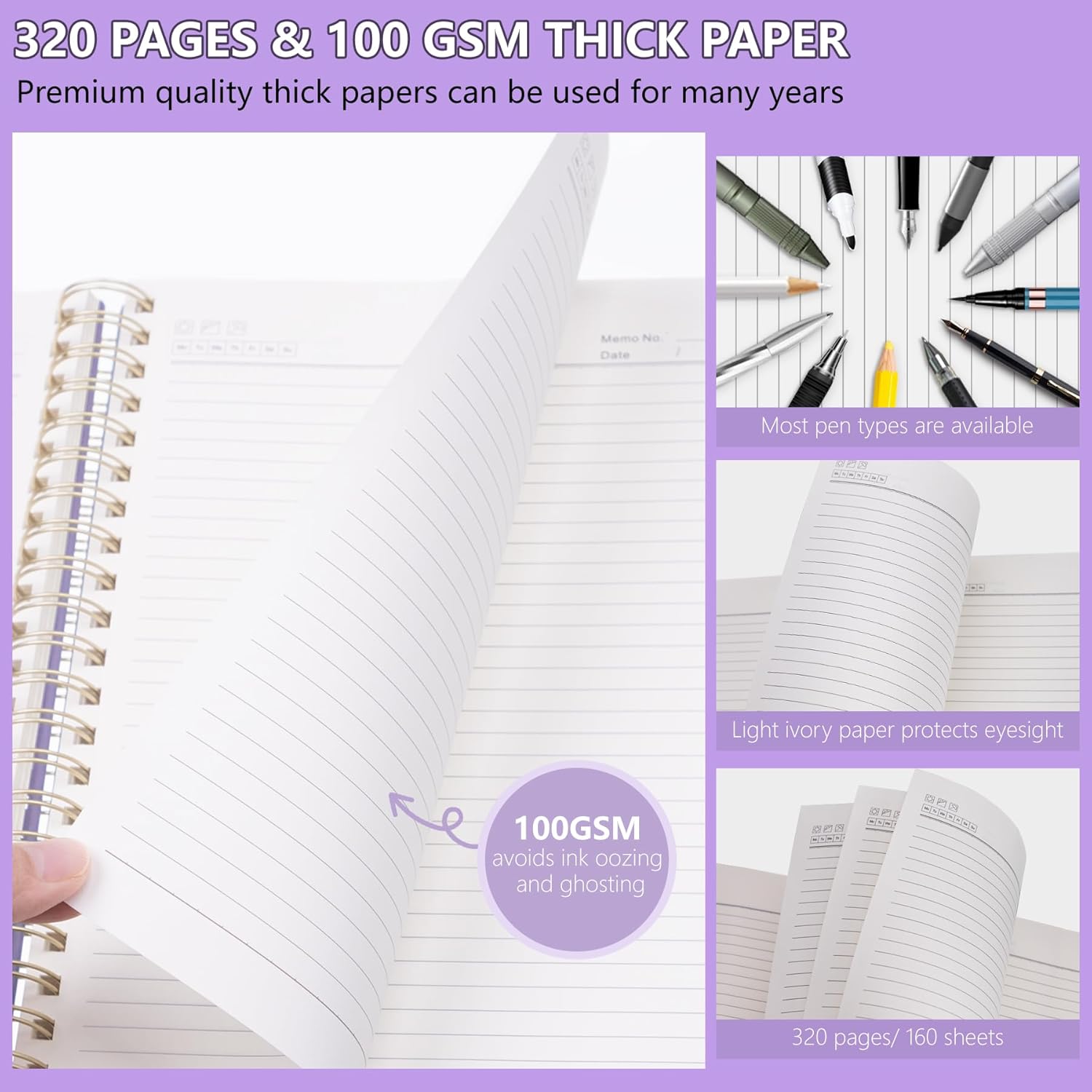 - 320 Pages & 100 GSM Spiral Journal: B5 size 7"x 9.7" notebook, 160 sheets/320 pages lined paper are enough to last you a whole year. 100gsm premium paper, which is thicker than plain paper, can write on both sides, with no ink bleeding through and ghosting, suitable for most types of pens