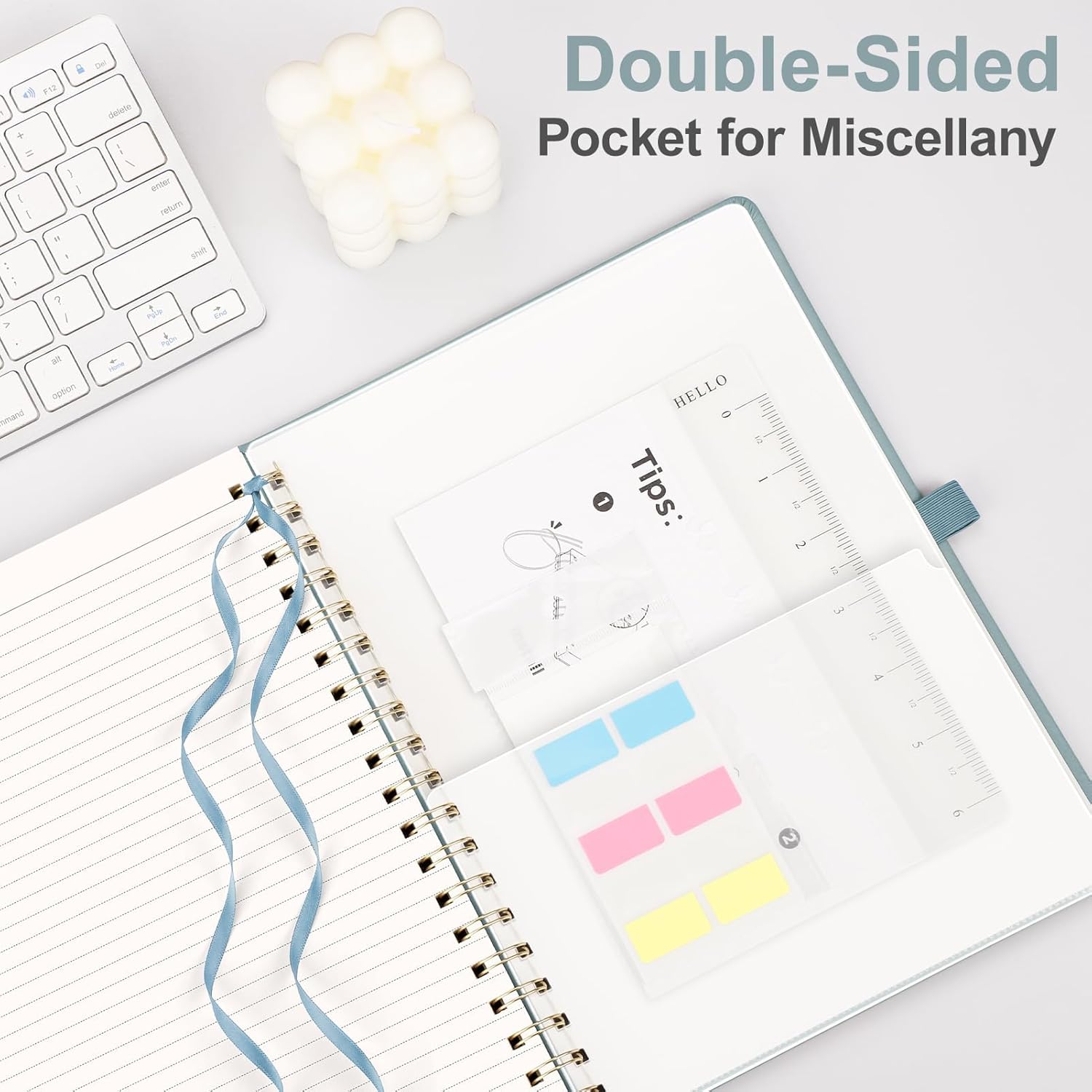 - PRACTICAL LAYOUT: Equipped an elastic band, a pen holder and removable bookmark ruler to keep your notebook organized. Comes with a DIY bookmark with a ribbon for self-attachment to the spiral, serving as a bookmark. Features a double-sided pocket for storing miscellany and 18pcs sticky notes for additional organization and reminders