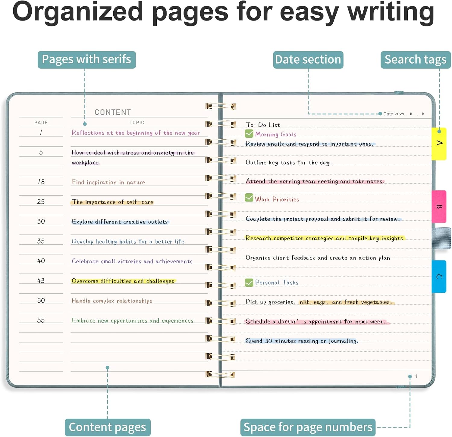 - ORGANIZED AND PRACTICAL NOTEBOOK: Our lined spiral notebook features 140 numbered pages and 4-page blank table of contents. In a medium A5 size 5.7" × 8.3", providing ample writing space while remaining lightweight and easy to carry