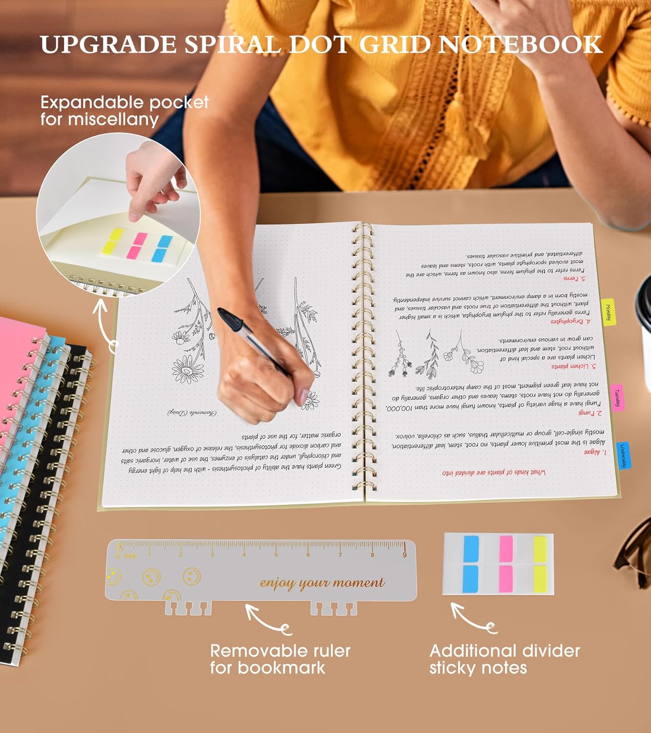 - 【Strong Spiral Metal Twin-Wire】 Our spiral dot grid journal notebook has a sturdy gold-color double wire spiral with easy-to-turn pages and keeps pages attached reliably, while still staying flat when opened, which reading more convenient and taking notes more efficient. Spiral dotted notebook easy to tear-off and fold over, as well as flip the cover back, giving you a better writing experience. Golden spiral bound adds aesthetic matching, it’s the perfect big notebook for journaling.