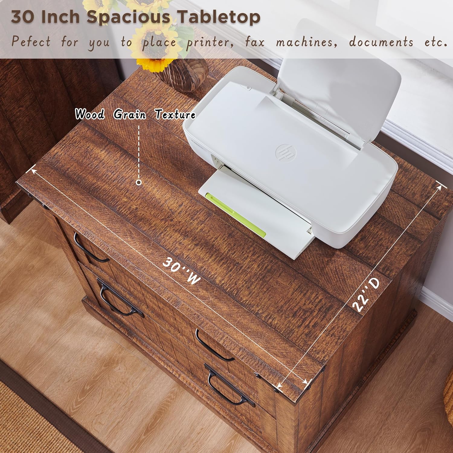 - 30 Inch Spacious Desktop:This office filing cabinet is a powerful assistant for your efficient work. 30 inches spacious desktop has a rustic finish with a delicate touch, being stain-resistant and easy to clean. No matter if you use it intensively for a long time or accidentally cause bumps or water spills, it will always remain aesthetically pleasing and practical.
