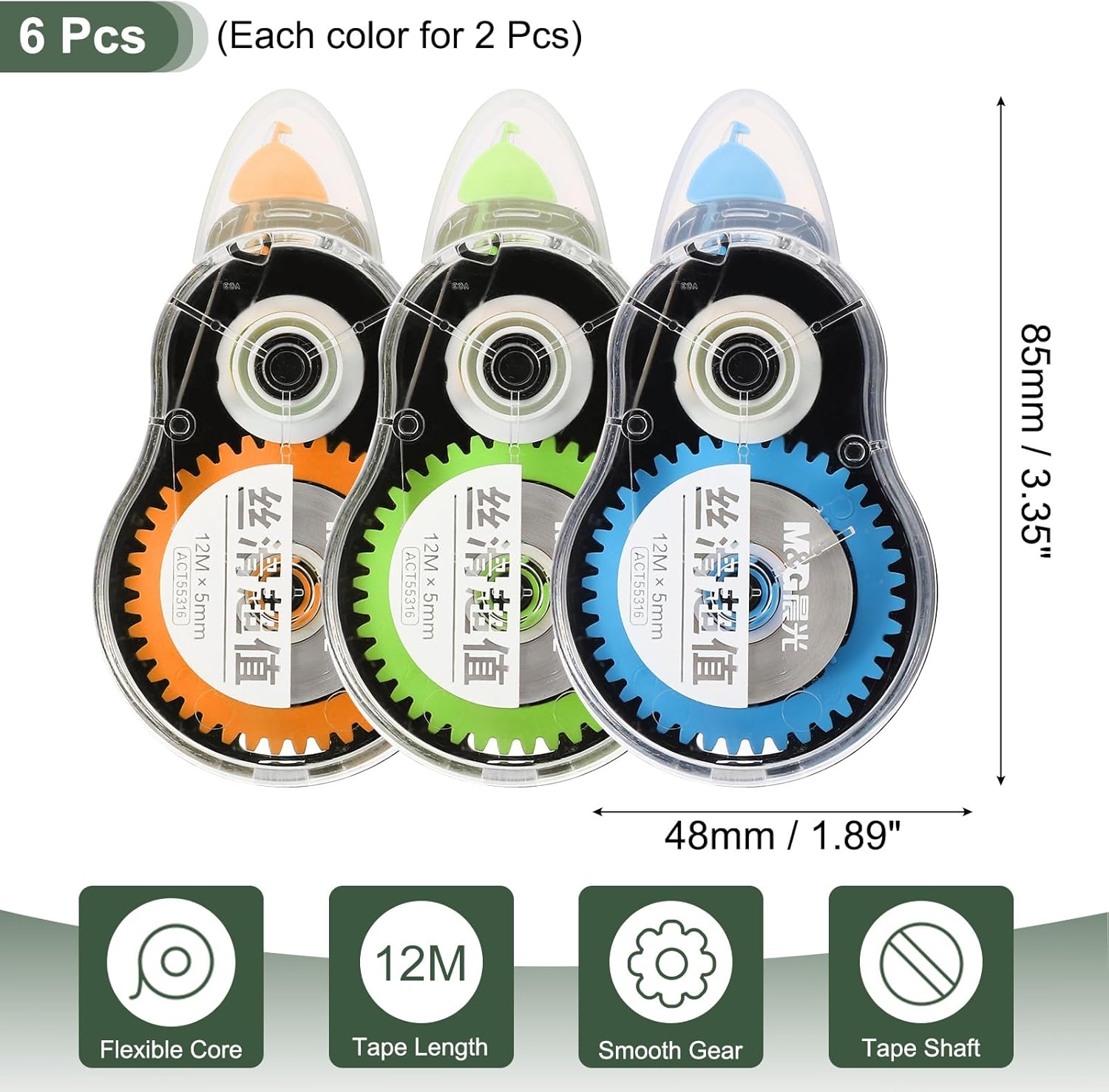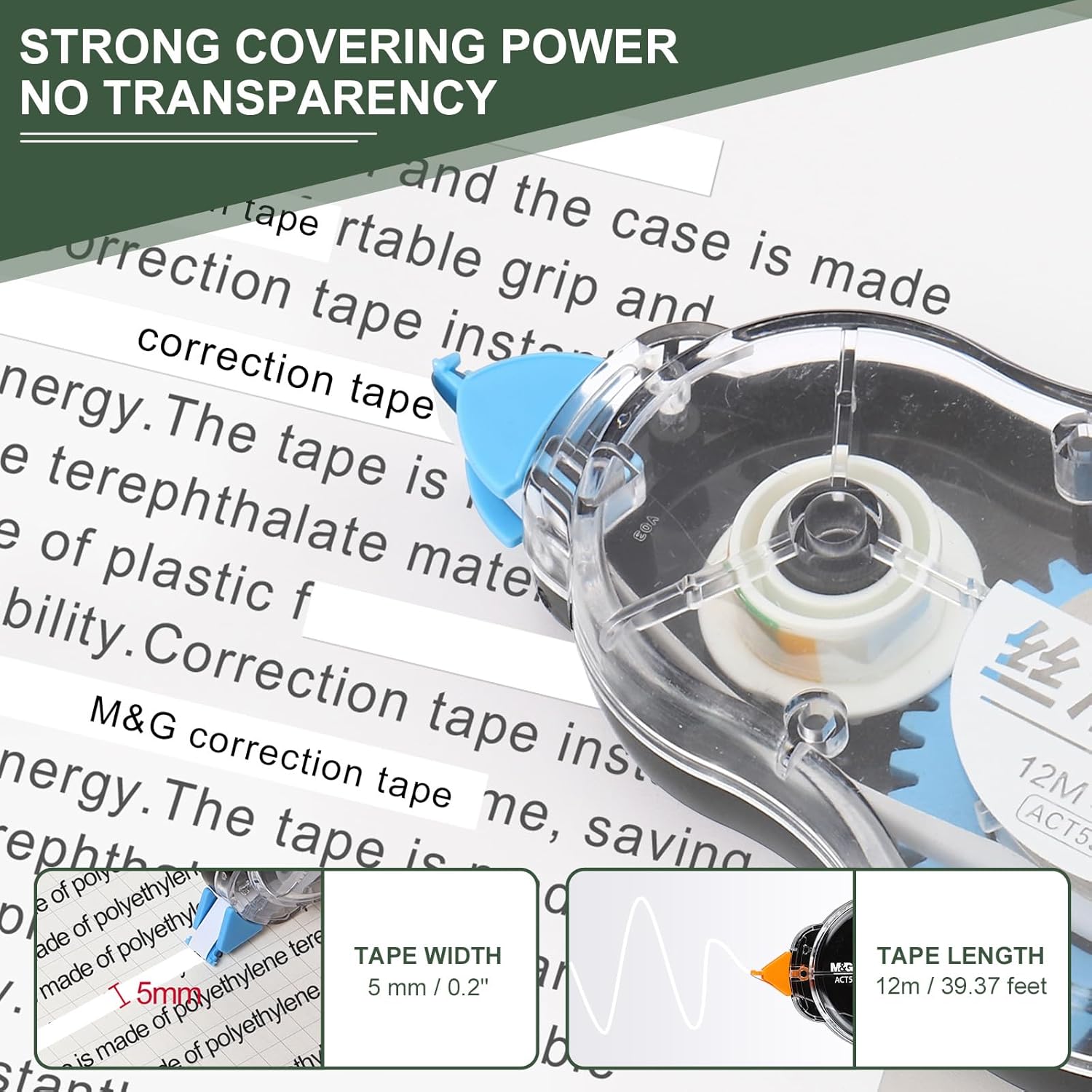 - 【Tear-resistant tape】M&G uses upgraded PET transparent correction tape, no breakage, no wrinkles, strong coverage. The tape is clean and not easy to break. Tape Width: 5mm / 0.2 inch; Tape Length: 12 m / 39.37 ft; Packing List: 6 x Correction Tape