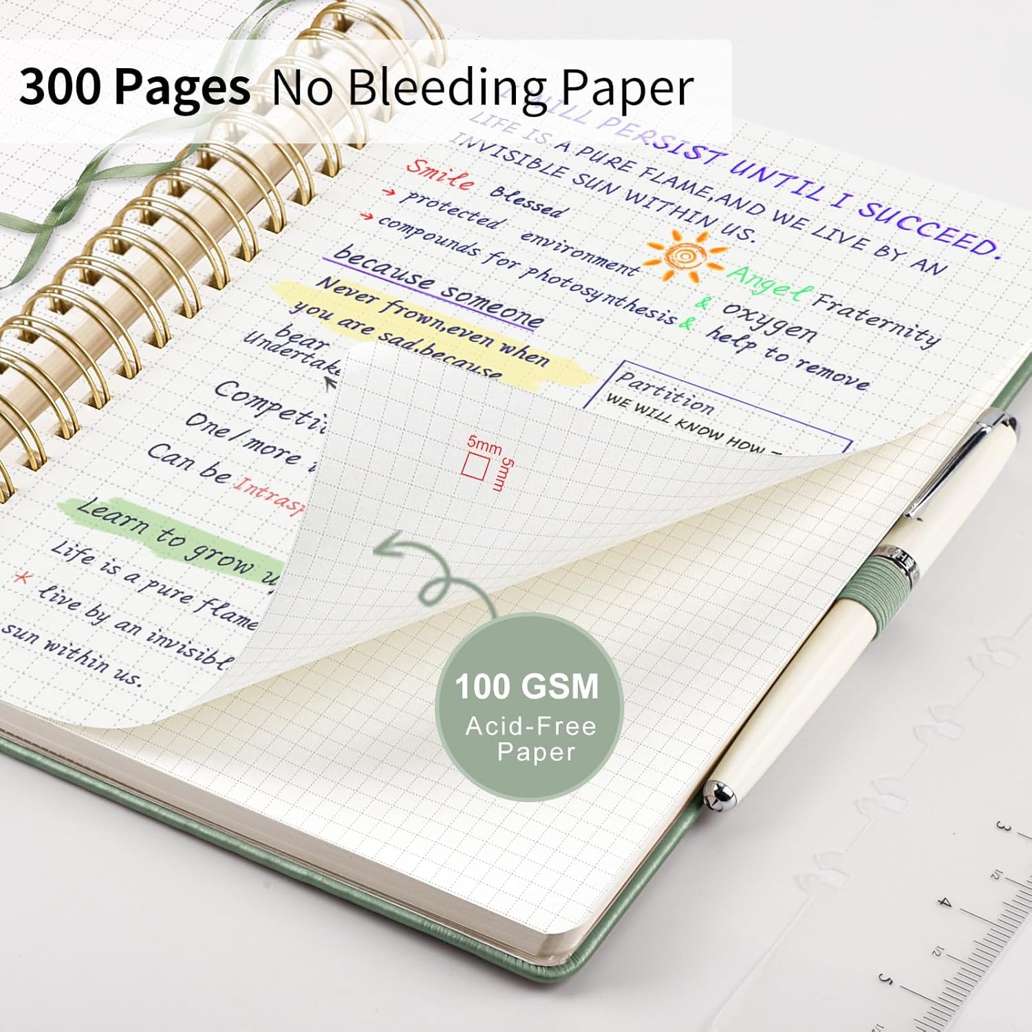 EMSHOI Spiral Graph Paper Notebook - 300 Pages, 100 GSM Thick Grid Notebook, A5 Small Hardcover Leather Journal for Women Men Writing Engineering Graphing, 5.7" x 8.22", Light Green