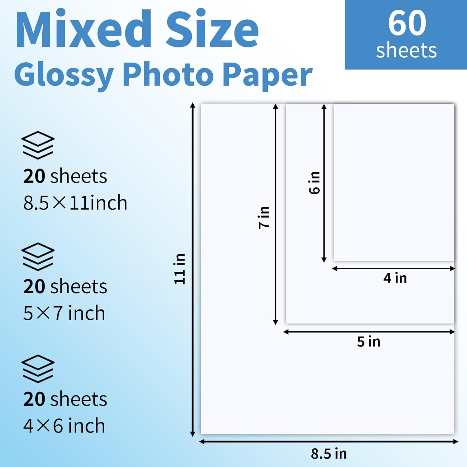 60 Sheets Glossy Photo Paper, 4x6 5x7 8.5x11 inch Inkjet Photo Printer Paper, Instant Dry Picture Paper for DIY Chip Bag, Flyers, Cards, Calendars and Brochures(180gsm/48lb) (mixed size)