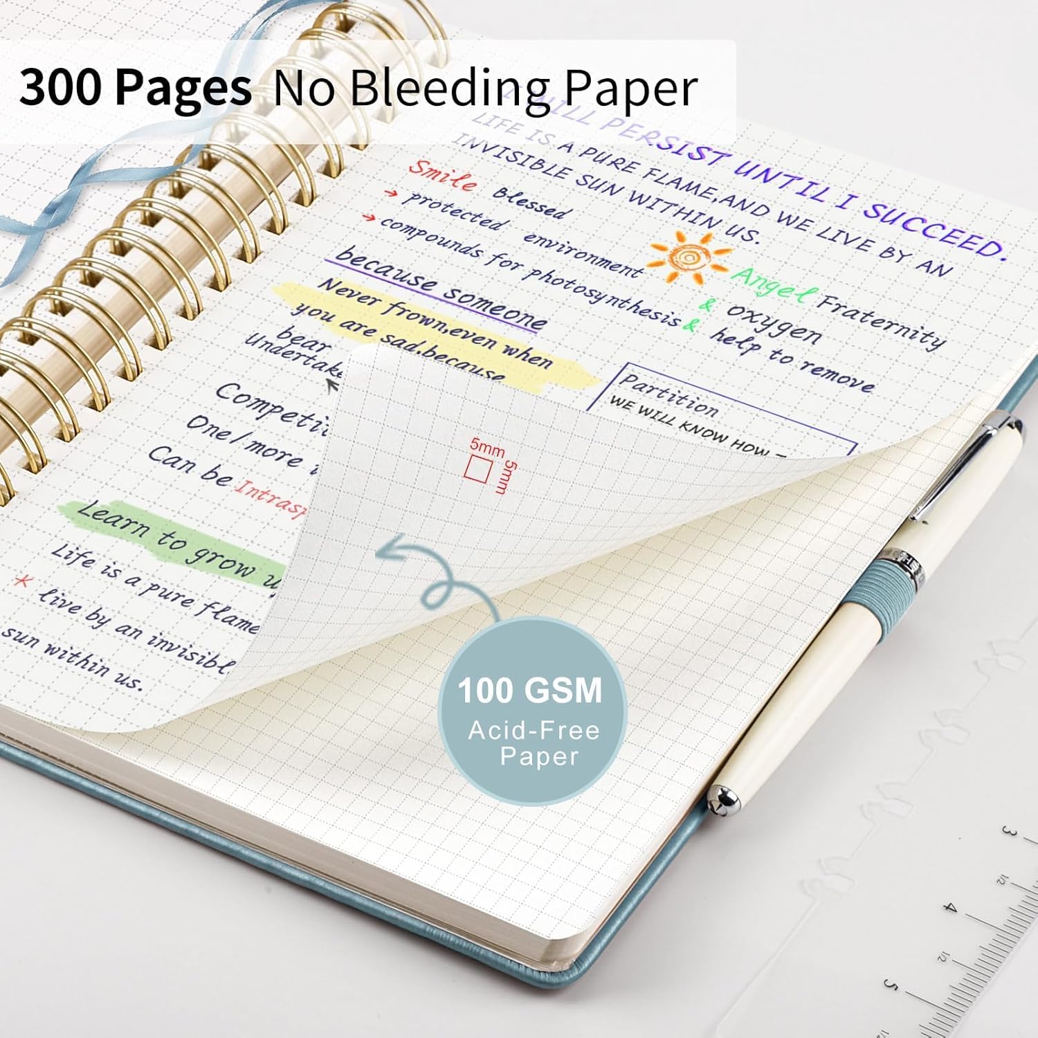 EMSHOI Spiral Graph Paper Notebook - 300 Pages, 100 GSM Thick Grid Notebook, A5 Small Hardcover Leather Journal for Women Men Writing Engineering Graphing, 5.7" x 8.22", Gray Blue