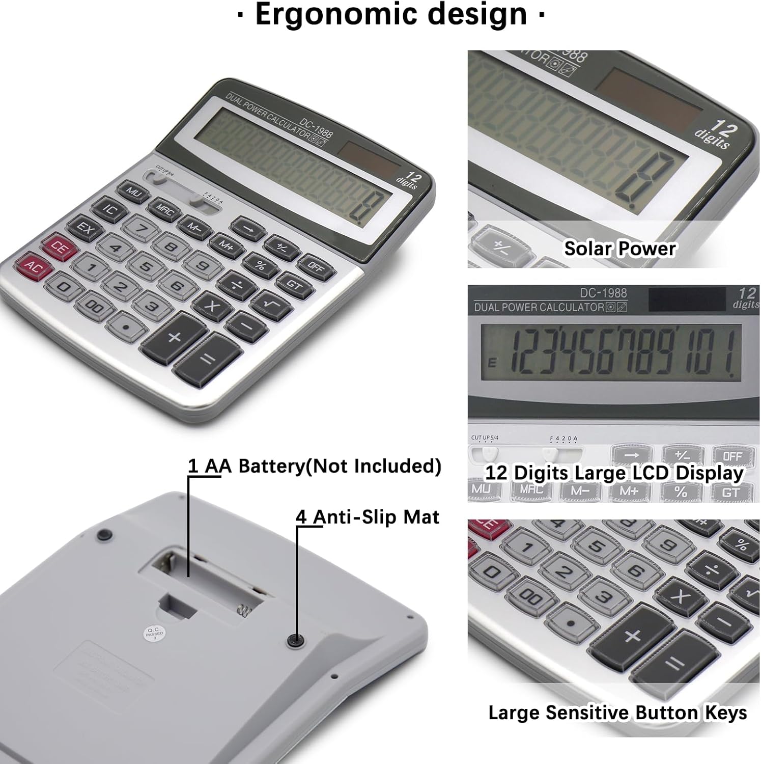 - 【Large LCD Display】The office calculator is equipped with huge LCD screen display clear 12-Digit big numbers.Desktop calculator tilted and angled display allows you to easily see your calculations without straining your eyes