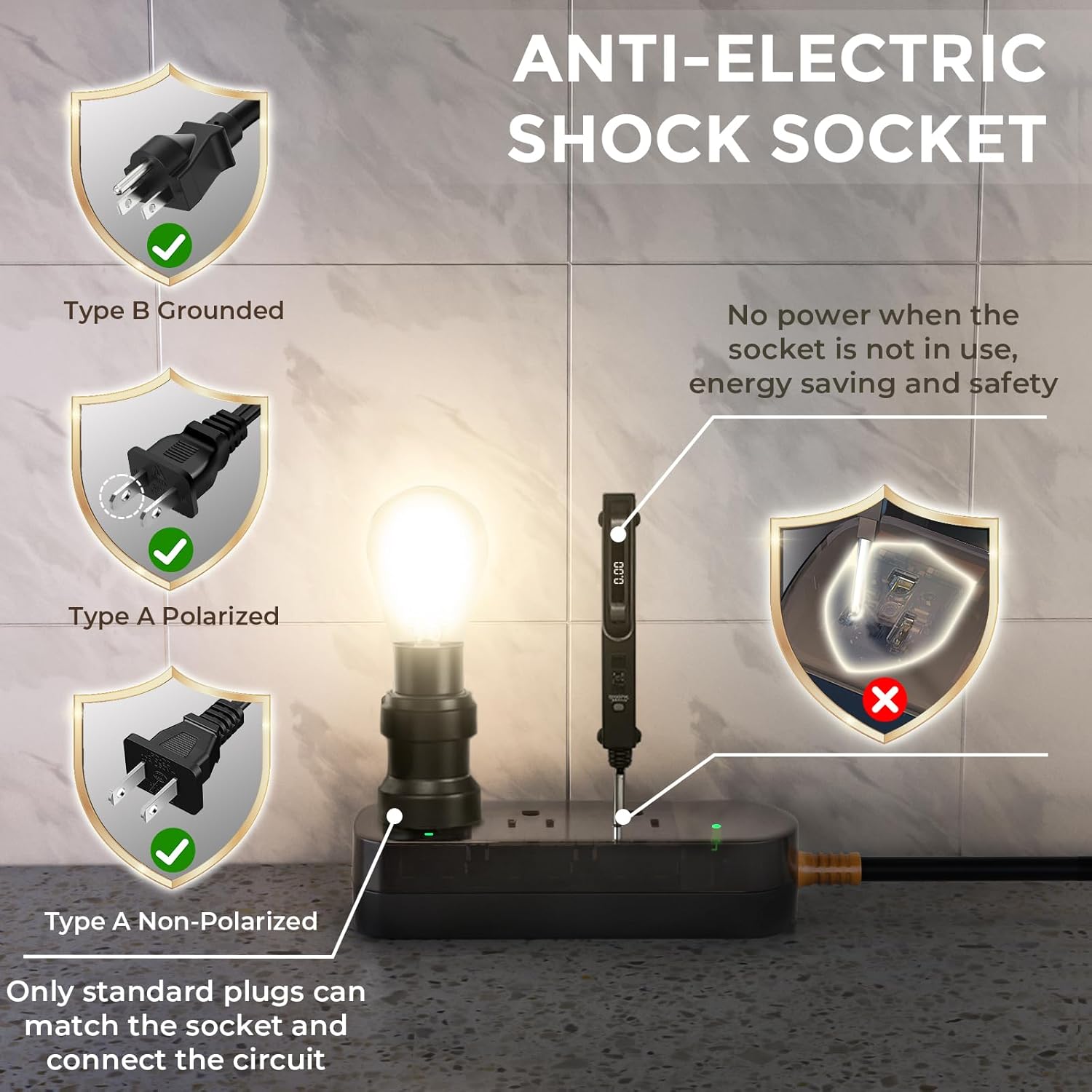 - Safety Structural Design:Our patented socket has been designed with safety as a top priority. It is compatible with standard American plugs and is equipped with a safety lock where the plug needs to be fully inserted to energise. This limits access to unintended items and helps prevent potential electrocution.