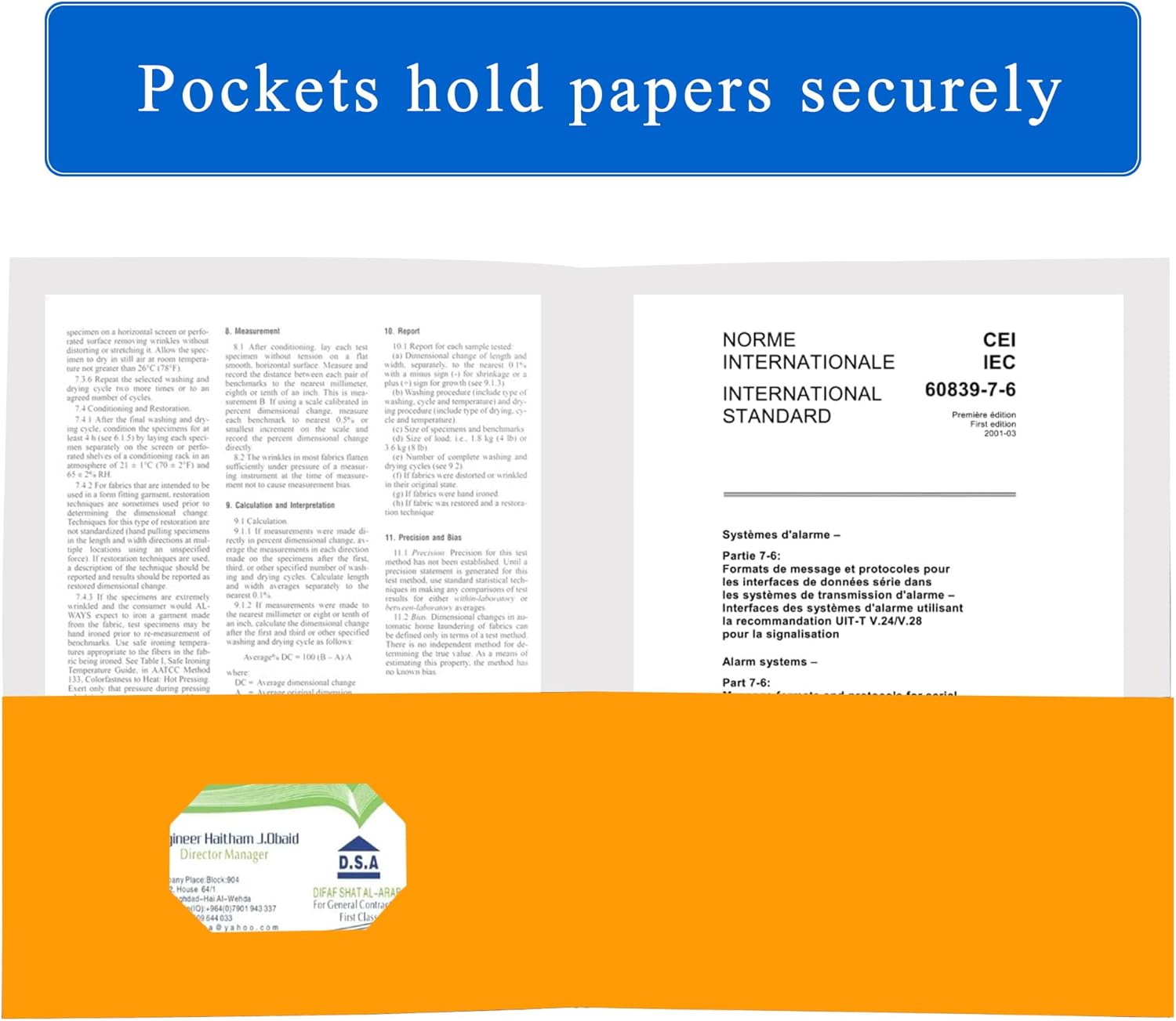 - Professional Design:Two pockets provide storage space for paper,brochures, and more,Each folders for documents measures 9" x 11.5",with two 5" pockets,holds (over 100) sheets of paper,and has a universal business card holder on the right pocket.