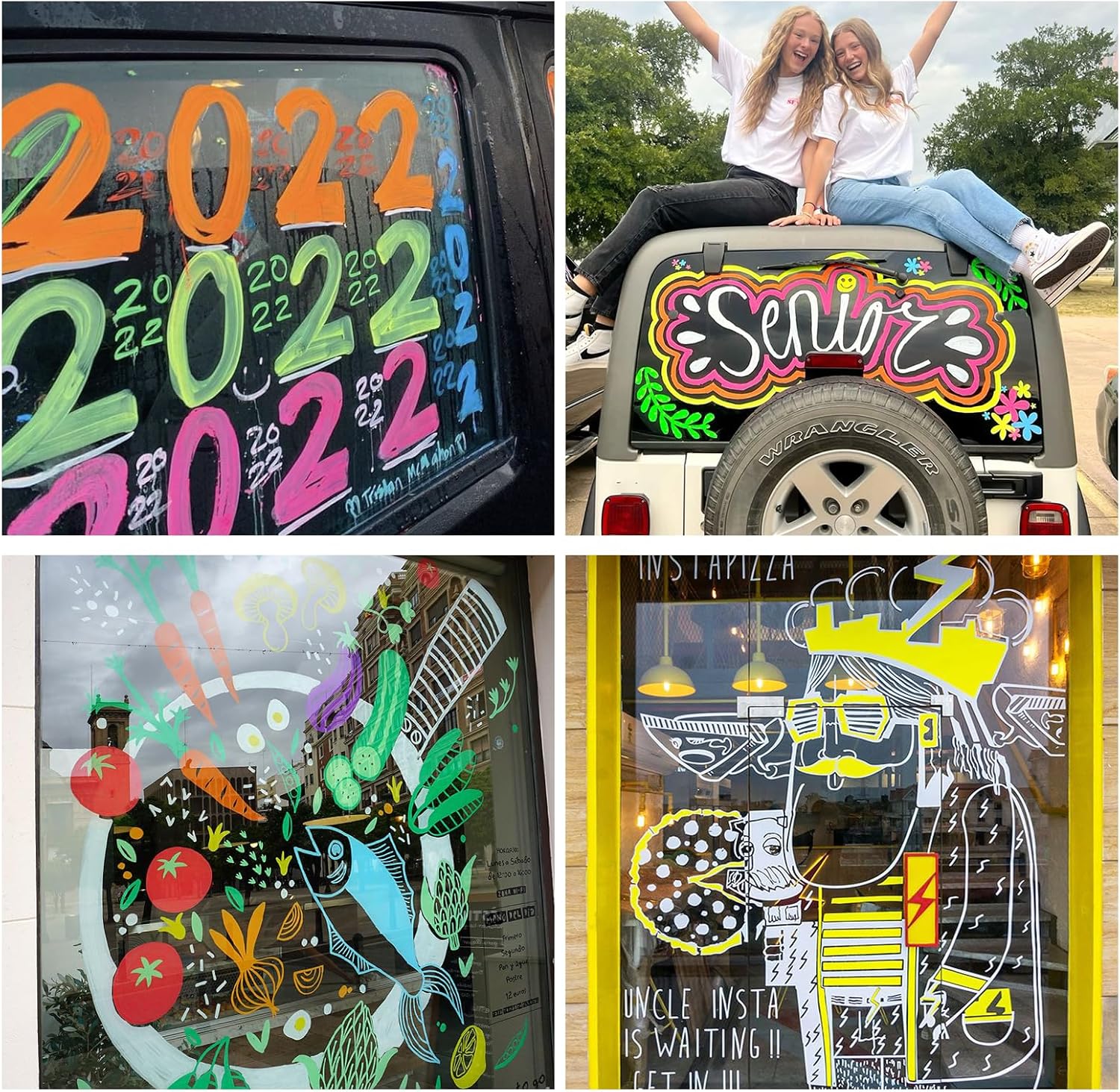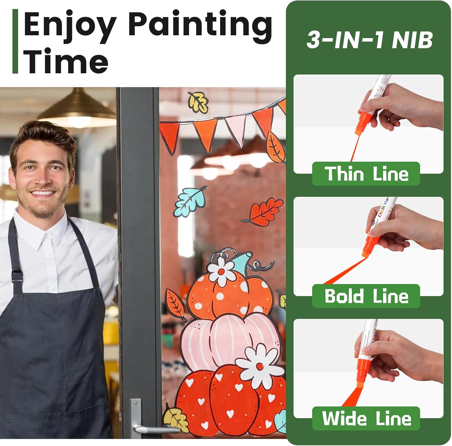 - 10MM 3-IN-1 TIP: The 10mm nib allows allows you to draw fine, bold, and wide lines, making these window markers for glass washable ideal for both detailed and large designs. Effortlessly switch between detailed work on wide strokes on windows and blackboards.