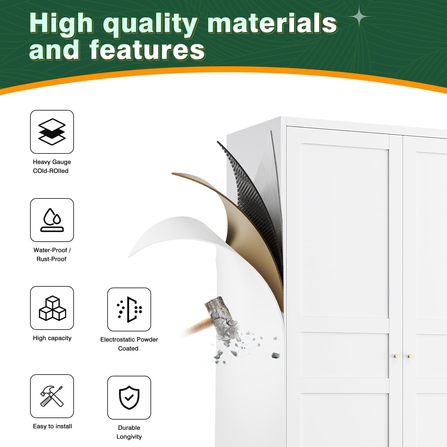 - Superior Materials : Our wardrobe is constructed from large thickened cold-rolled steel plates for exceptional strength and durability. The wardrobe is finished with an electrostatic powder coating, making it scratch resistant, wear resistant and easy to clean. This design is more durable than traditional wooden wardrobes.