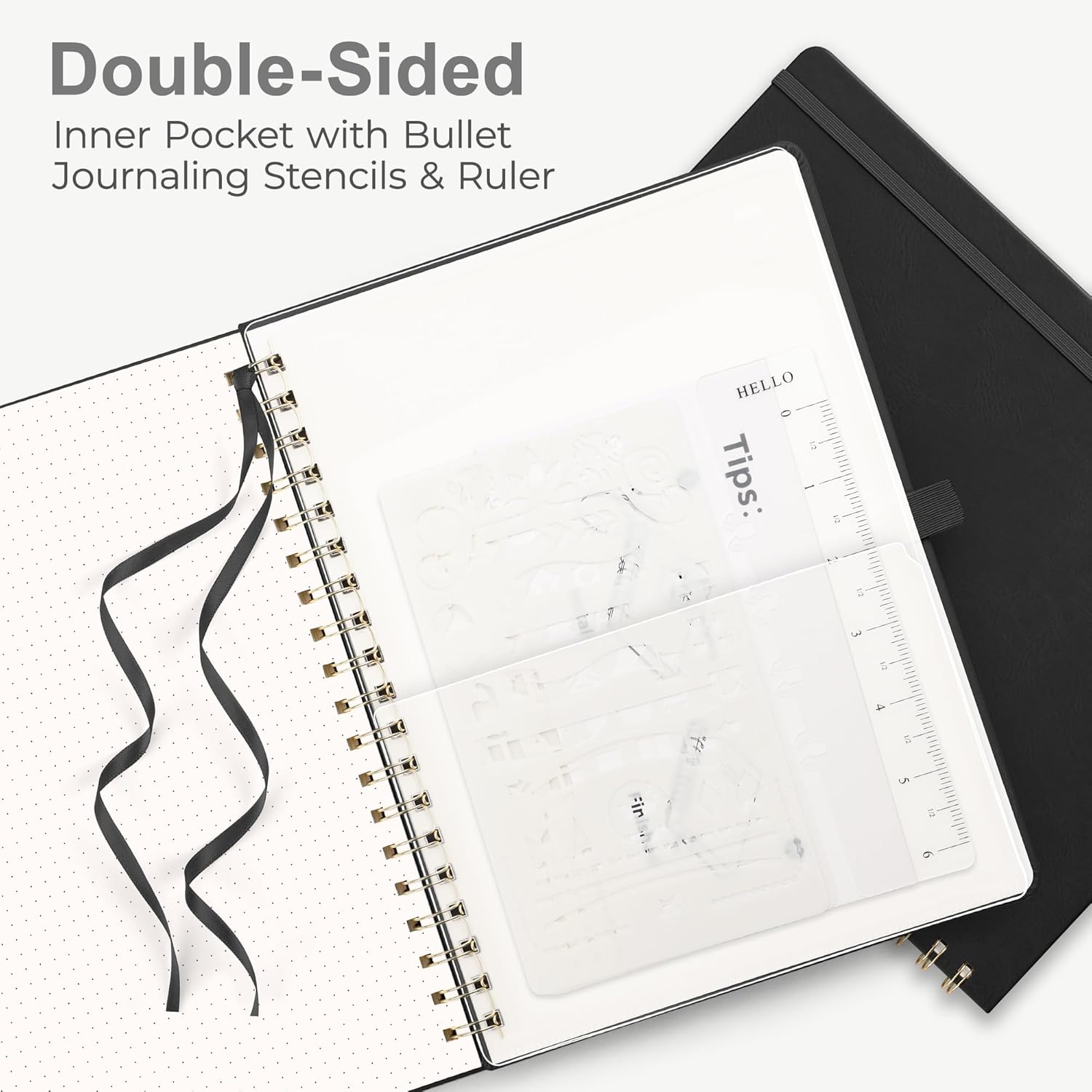 - BULLET DOTTED JOURNAL: RETTACY Bullet Dotted Journal comes in a A4 (8.5'' × 11'') size, 110 Pages, Leather Hardcover, Sturdy Twin-wire Spiral Bound, 5 mm dot writing space, 100 GSM Paper, Pen Holder, Elastic Closure Bands, Inner Pocket, Ribbon Bookmark, Lightweight Ruler, Bullet Journaling Stencils