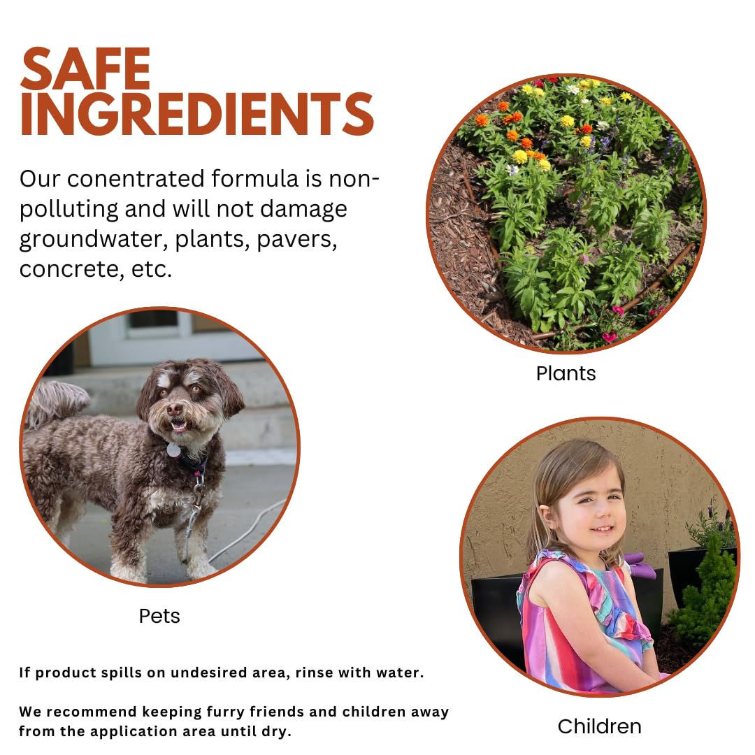 - SAFE TO USE: Non-toxic. Safe for areas inhabited by pets, plants, and children. Will not damage outdoor landscaping, groundwater, pavers, concrete, asphalt, or clothing. Have a spill? Rinse the area with water.