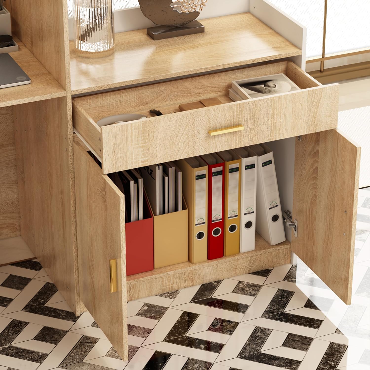 - 【Ample Storage Space】This reception desk is not only aesthetically pleasing, but also has enough storage space with a wide countertop and a keyboard tray. There is a cabinet with 2 doors and 1 drawer attached to the side, which is convenient for organizing and storing often used files or stationery.